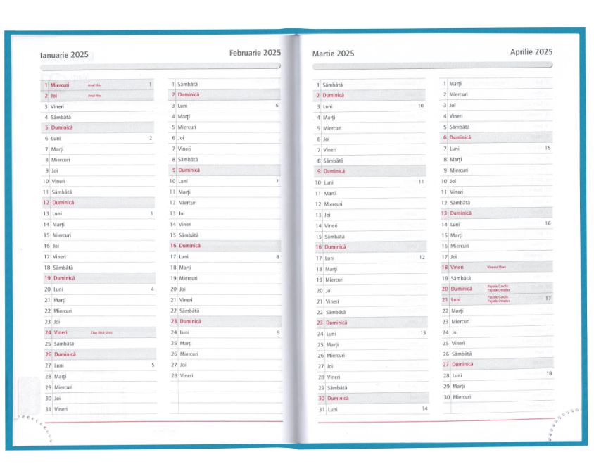 - Calendar detaliat pentru anul 2024 (la începutul agendei) și pentru anul 2025 (la finalul agendei)