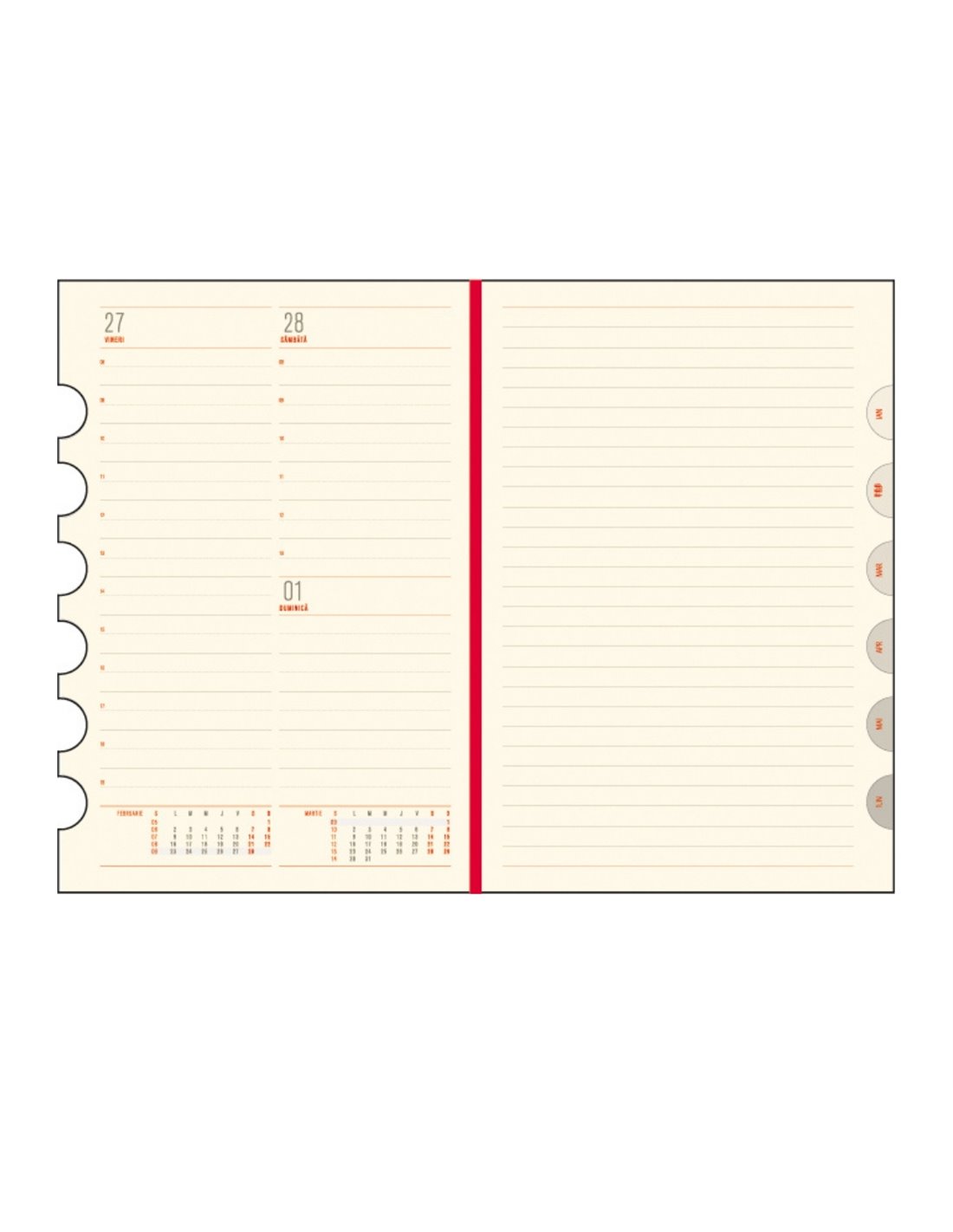 Index lateral ștanțat: Facilitează accesul rapid la lunile anului, pentru o planificare ușoară și eficientă.