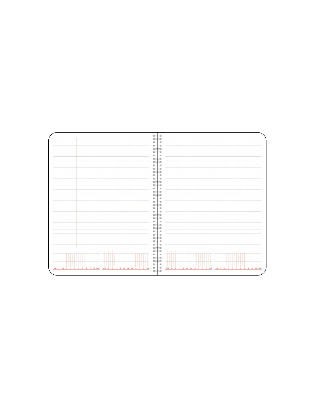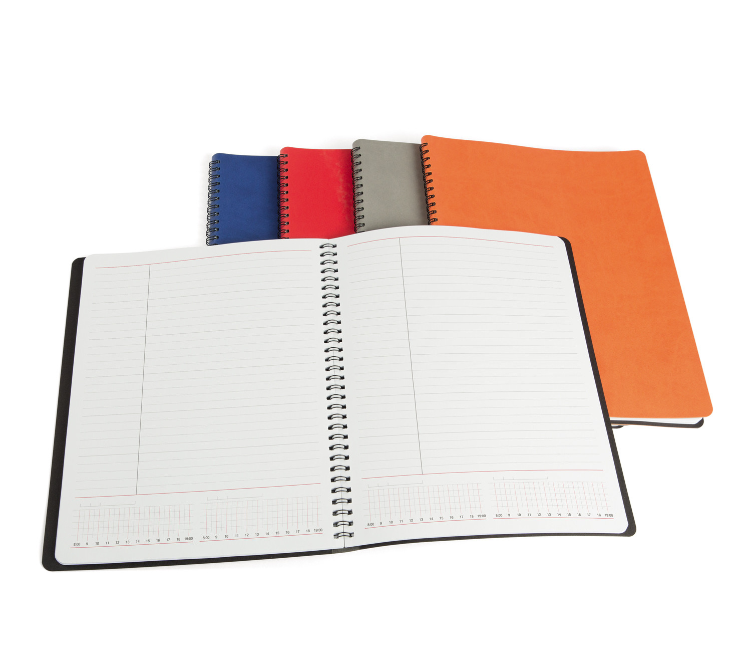 Spira metalică neagră permite o deschidere completă, oferind confort și stabilitate la scriere. Coperta specială din poliuretan (PU) este flexibilă, moale la atingere și rezistentă, conferind un aspect elegant și profesional. Atât blocul interior, cât și coperta dispun de colțuri rotunjite pentru un design rafinat, iar colțurile perforate facilitează marcarea paginilor utilizate.