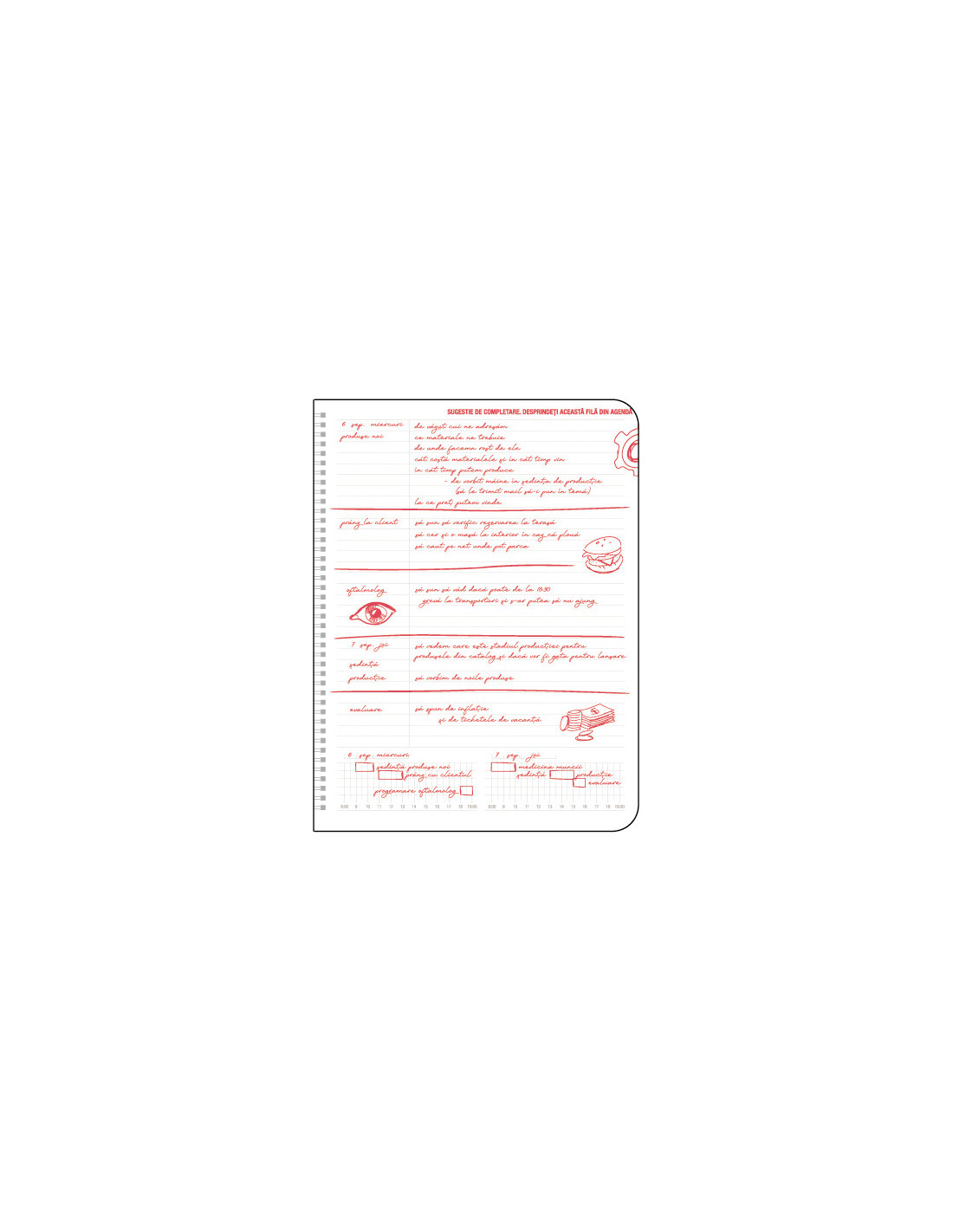 Interiorul cuprinde 128 de pagini de hârtie offset albă, 70 g/mp, completate de 4 pagini de informații utile. Imprimarea în două culori – roșu și gri – oferă o notă de rafinament și o lizibilitate excelentă, făcând scrisul mai plăcut și mai organizat.