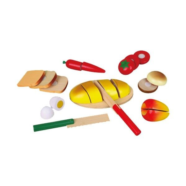 - Setul de alimente din lemn contine: tocator, cutit pentru paine, cutit pentru alimente, paine, ou, rosie, ardei, mar, paine toast si o cutie in care sunt depozitate.