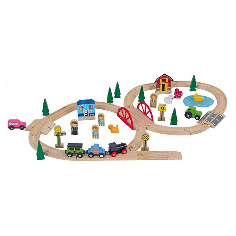 - Setul este alcatuit din 51 de piese din lemn de calitate: sine, macaz, treceri la nivel cu calea ferata, o locomotiva neagra cu aburi ce trage doua vagoane, un pod, o gara, un hambar, tractor, autoturism, animale, oameni, copaci si cateva indicatoare rutiere si feroviare.