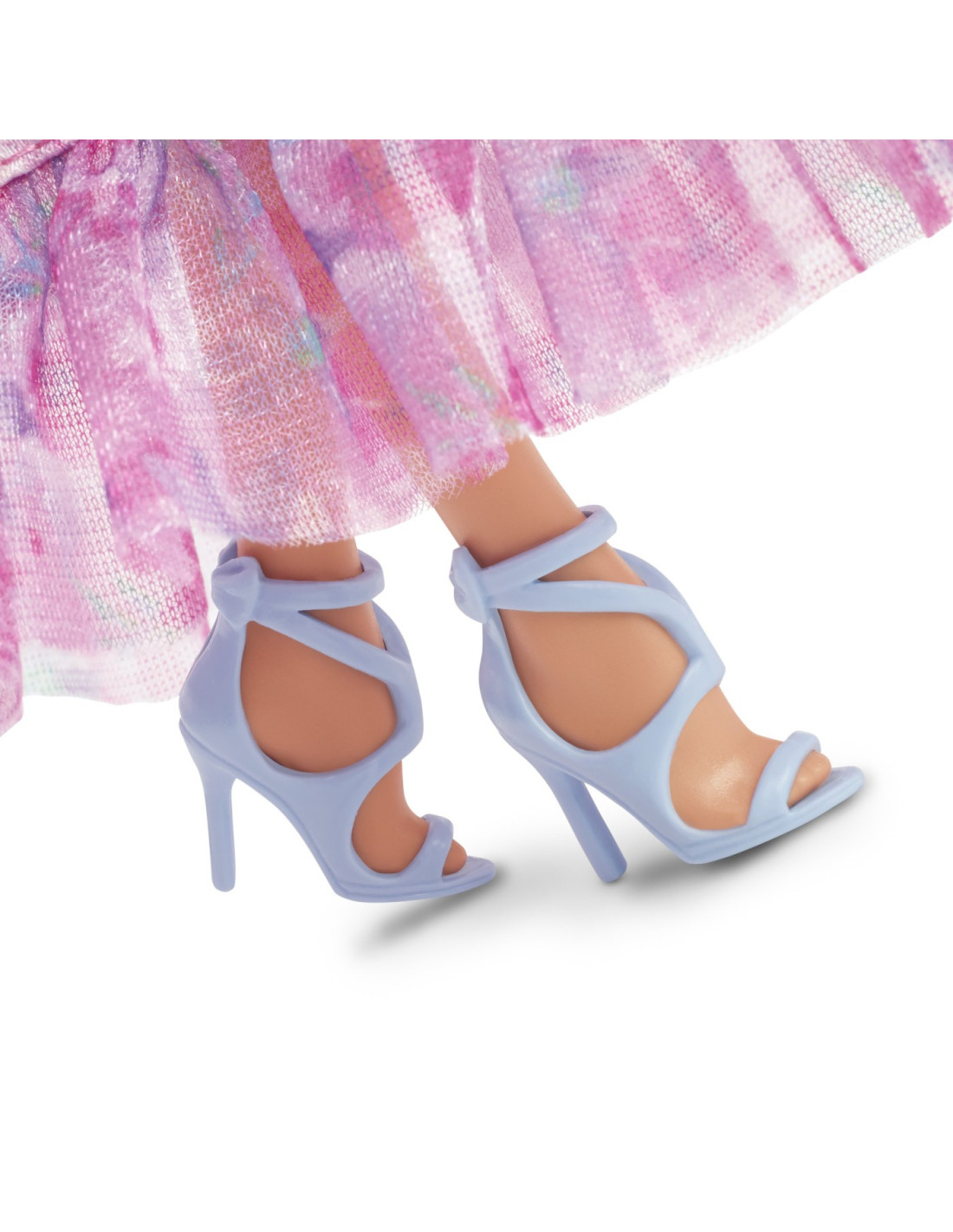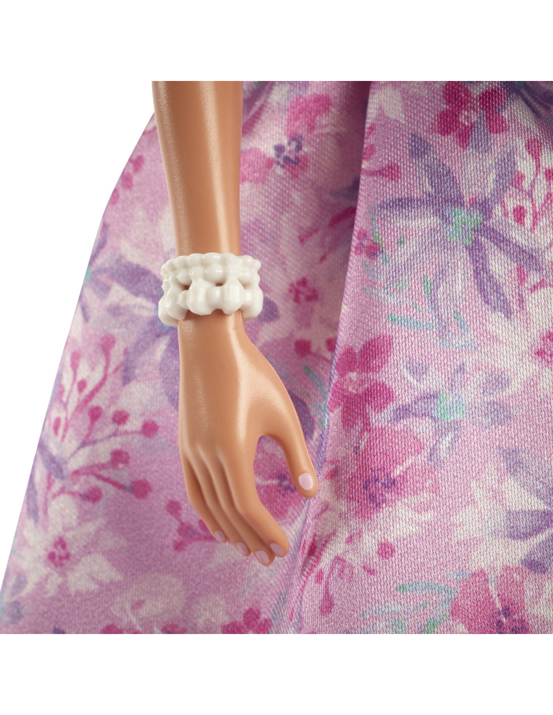 Aceasta papusa Barbie speciala poarta o rochie din satin cu flori imprimate.