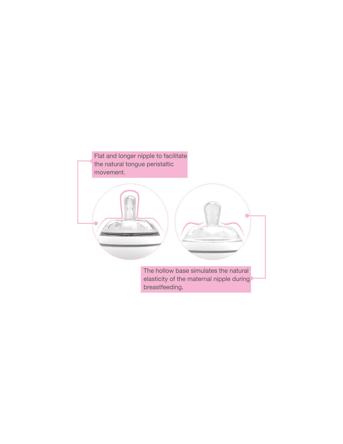 - Suportul tetinei plat si varful lung faciliteaza miscarea naturala a limbii in momentul hranirii.