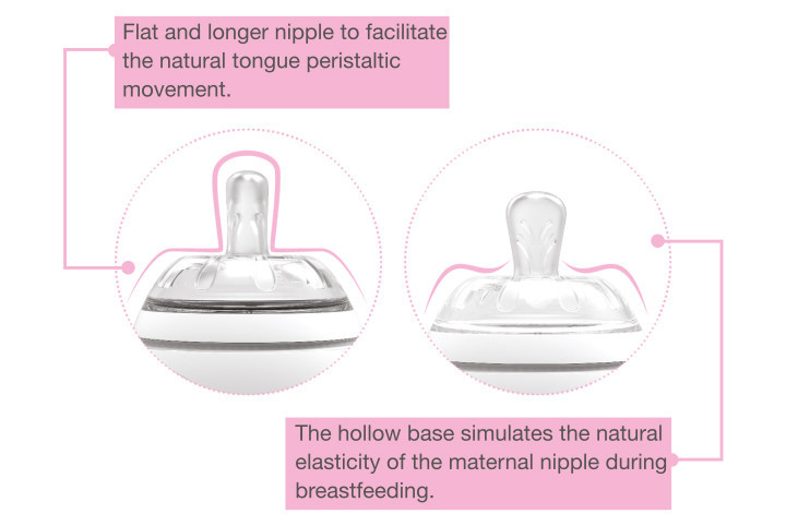 - Forma unica alungita a tetinei imita flexarea si miscarea sanului mamei si ajuta la hranirea usoara a copilului, creind o senzatie naturala asemanatoare alaptarii la san.