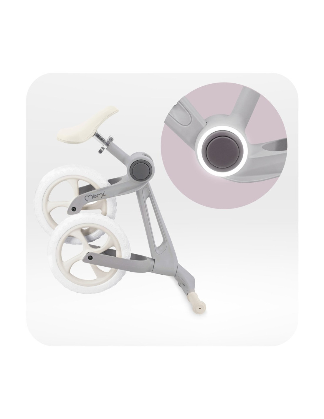 MoMi NORU este o bicicleta de echilibru unica, ce se remarca prin optiunea inovatoare de pliere a cadrului cu o simpla apasare de buton. Aceasta o face mult mai portabila!