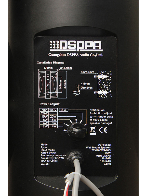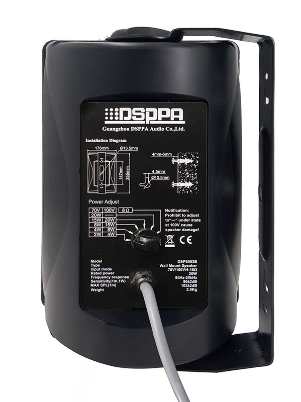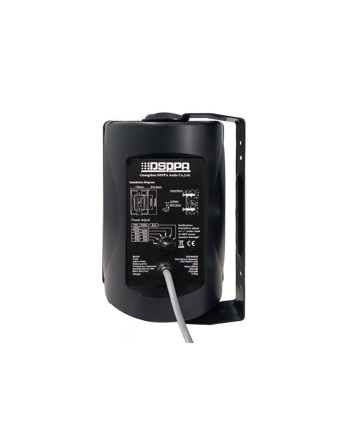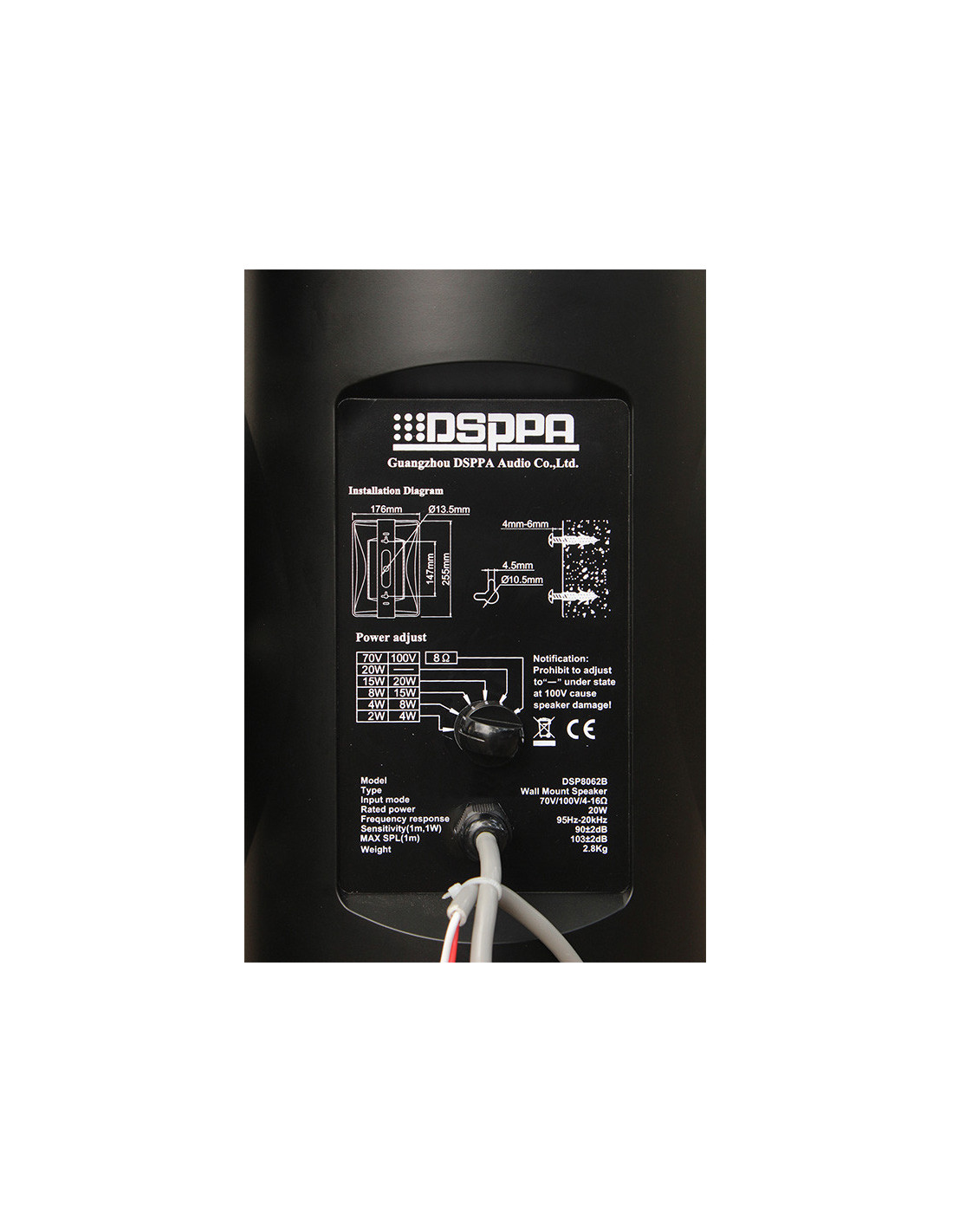 DSP8063 este un difuzor de perete cu un transformator de 70V/100V. Transmisiunea de 70V/100V este realizata la un voltaj ridicat. intr-un mod curent redus, lucru ce face posibila transmisia pe distante lungi si conexiunea paralele a mai multor difuzoare. Conexiunile multiple de putere de 2.5W la 30W sunt potrivite pentru diferite aplicatii ce pot varia in dimensiunea incaperii si in zgomotul ambiental.