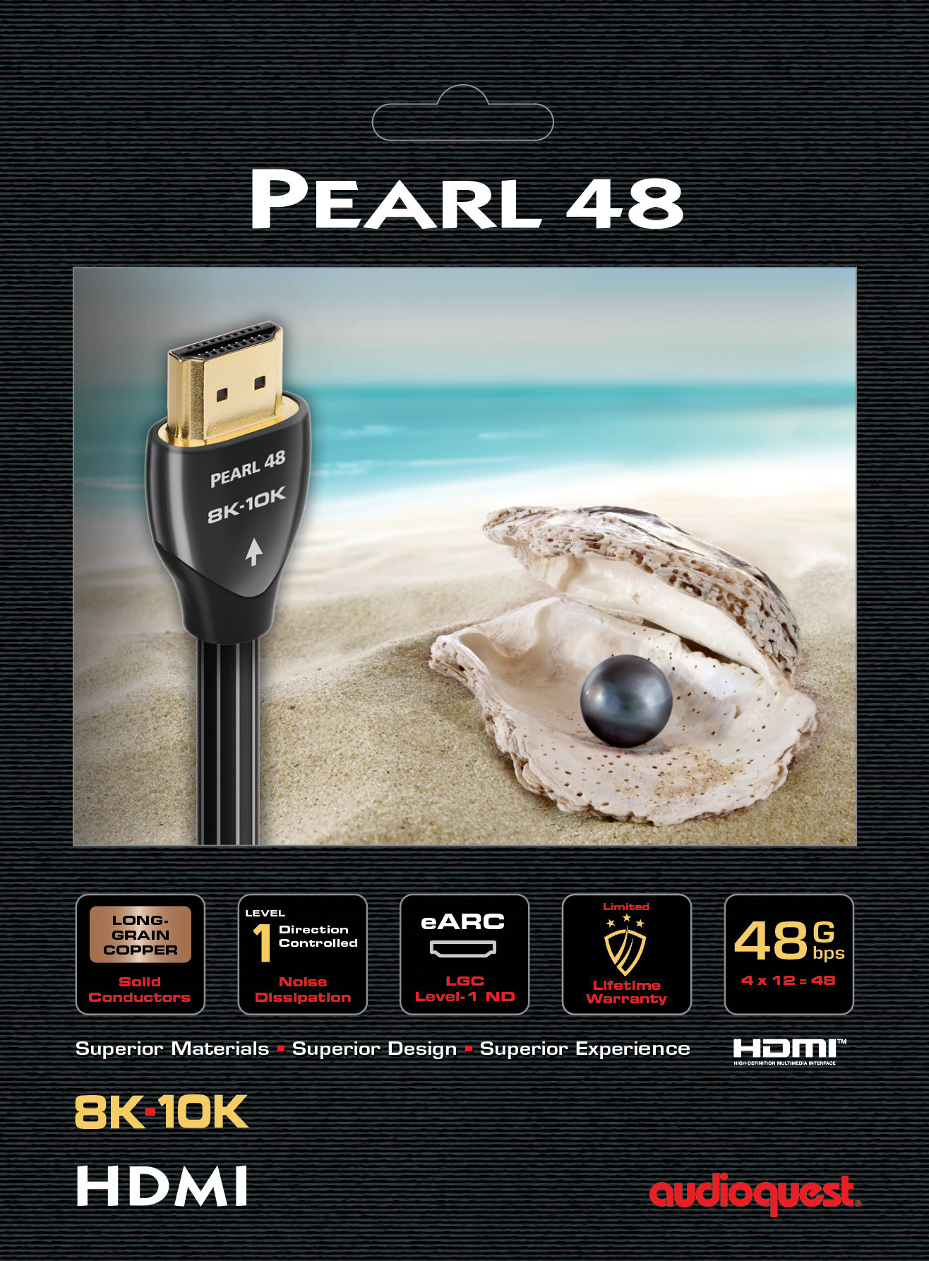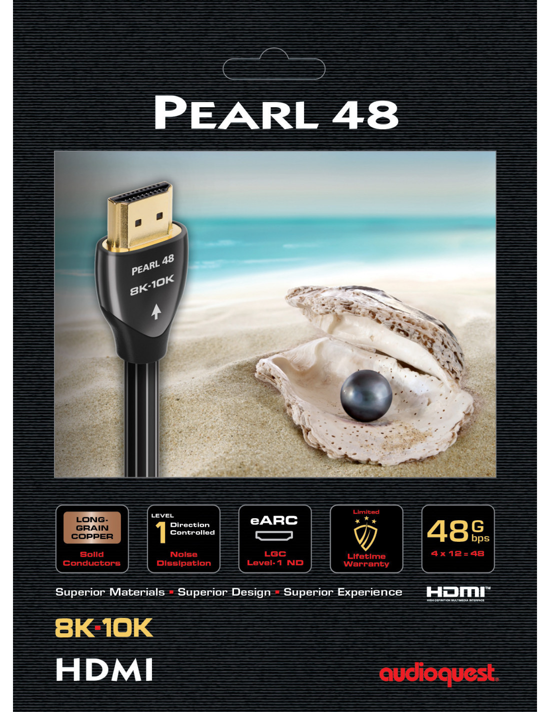 In cablurile HDMI AudioQuest HDMI, conductori solizi din Curpu cu Granulatie Lunga, Cupru placat cu Argint sau Argint cu Suprafata Perfecta imbunatatesc disiparea zgomotului si performanta in general. Modelul Pearl 48 foloseste modelul de Cupur cu Granulatie Lunga.
