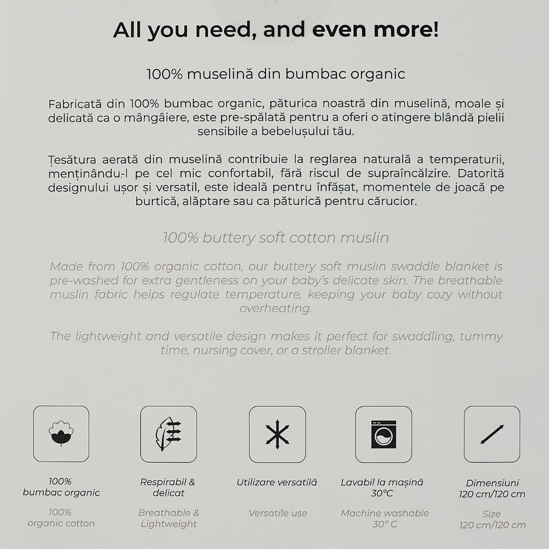 Dimensiune: 120 x 120 cm – suficient de generoasa pentru a fi folosita in multiple moduriTextura: Fina, aerata, cu o tesatura tip muselina cu doua straturi – moale de la prima atingereIngrijire: Lavabila la masina (30°C); devine tot mai moale cu fiecare spalareOrigine: produs responsabil, realizat cu grija pentru copil si mediu