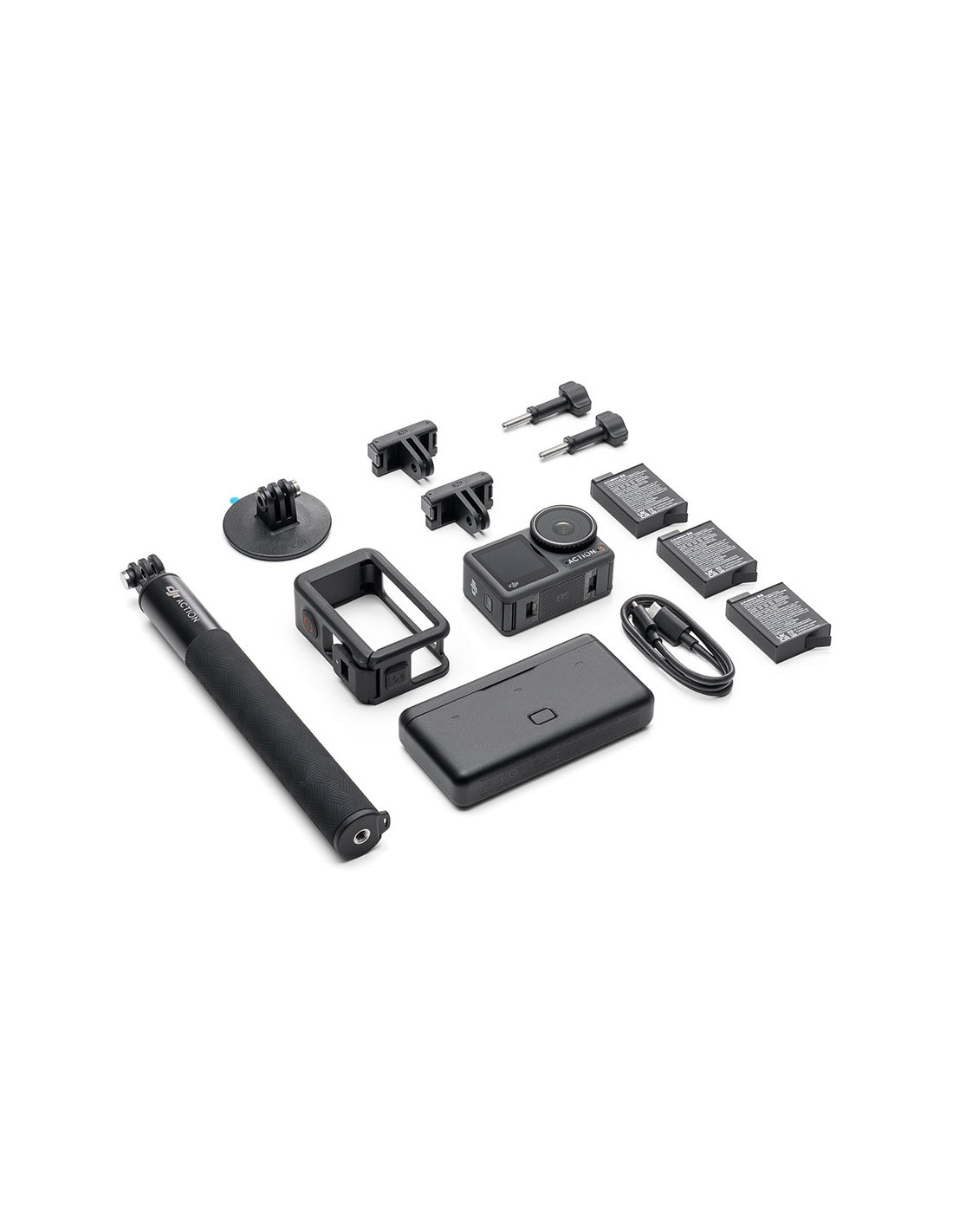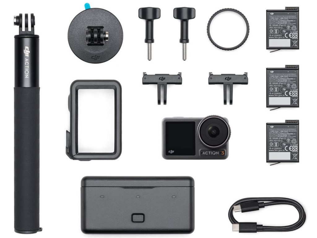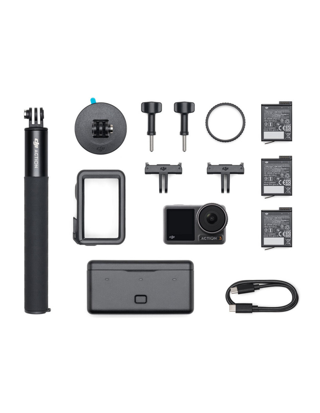 DJI Osmo Action 3 Adventure Combo este echipata cu trei baterii de mare capacitate, o montura magnetica cu 3 dinti, un cadru de protectie, doua protectoare de lentile din cauciuc, doua suporturi adaptoare cu eliberare rapida, o baza adeziva plata, doua suruburi de blocare, un tip USB. - Cablu de incarcare C, o carcasa de baterie multifunctionala si o tija de extensie pentru selfie.