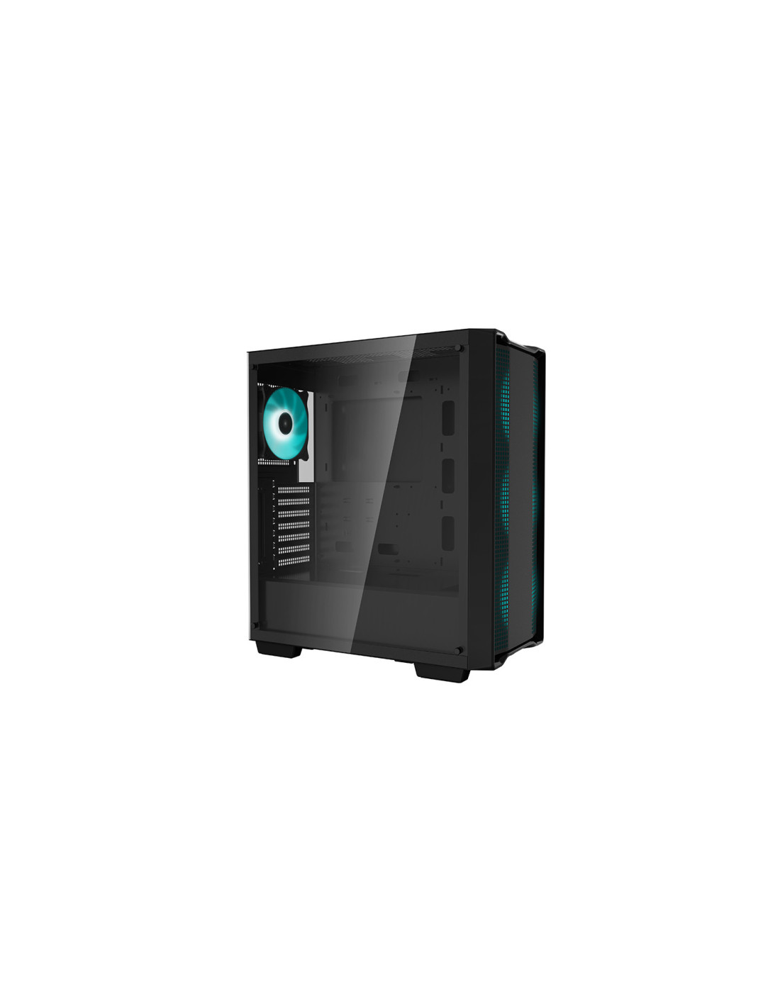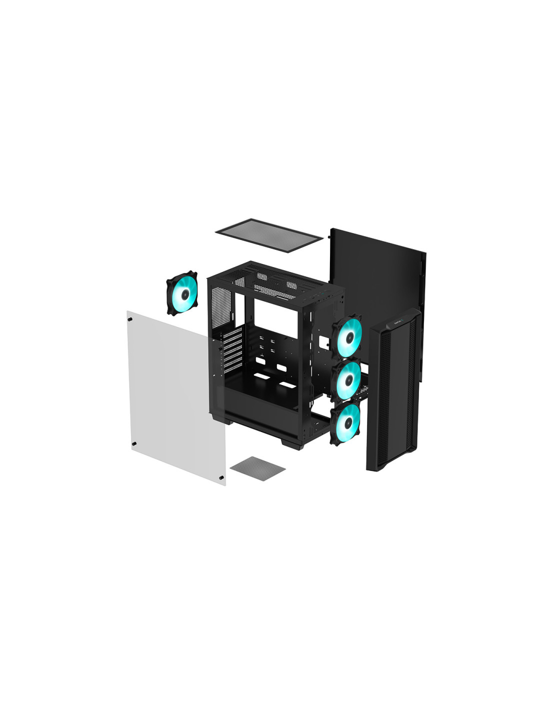 Carcasa Deepcool CC560 aRGB neagra, ABS+SPCC Steel ATX Mid Tower, fara sursa (tip ATX, montata jos), interior vopsit negru, 2x3,5”/2.5” (intern), 2+1x2,5” (intern), spate – 1x120mm aRGB LED fan (inclus) / 1x 140mm (optional), fata – 3x120mm aRGB LED fan (inclus) / 2x 140mm fan (optional), tavan – 2x 120mm / 2x 140mm fans (optional), 1x USB 2.0, 1x USB 3.0, HD Audio, design premium cu panou lateral din sticla securizata, sloturi expansiune: x7, ATX / microATX / Mini-ITX, inaltime maxima cooler procesor: 163mm, lungime maxima placa video: 370mm, suport radiatoare water cooling: spate – 120/140mm, fata – 120/140/240/280/360mm, tavan – 120/140/240/280mm, dimensiuni (LxWxH): 416x210x477mm, greutate: 5.25 kg