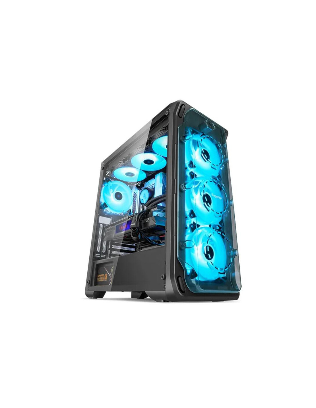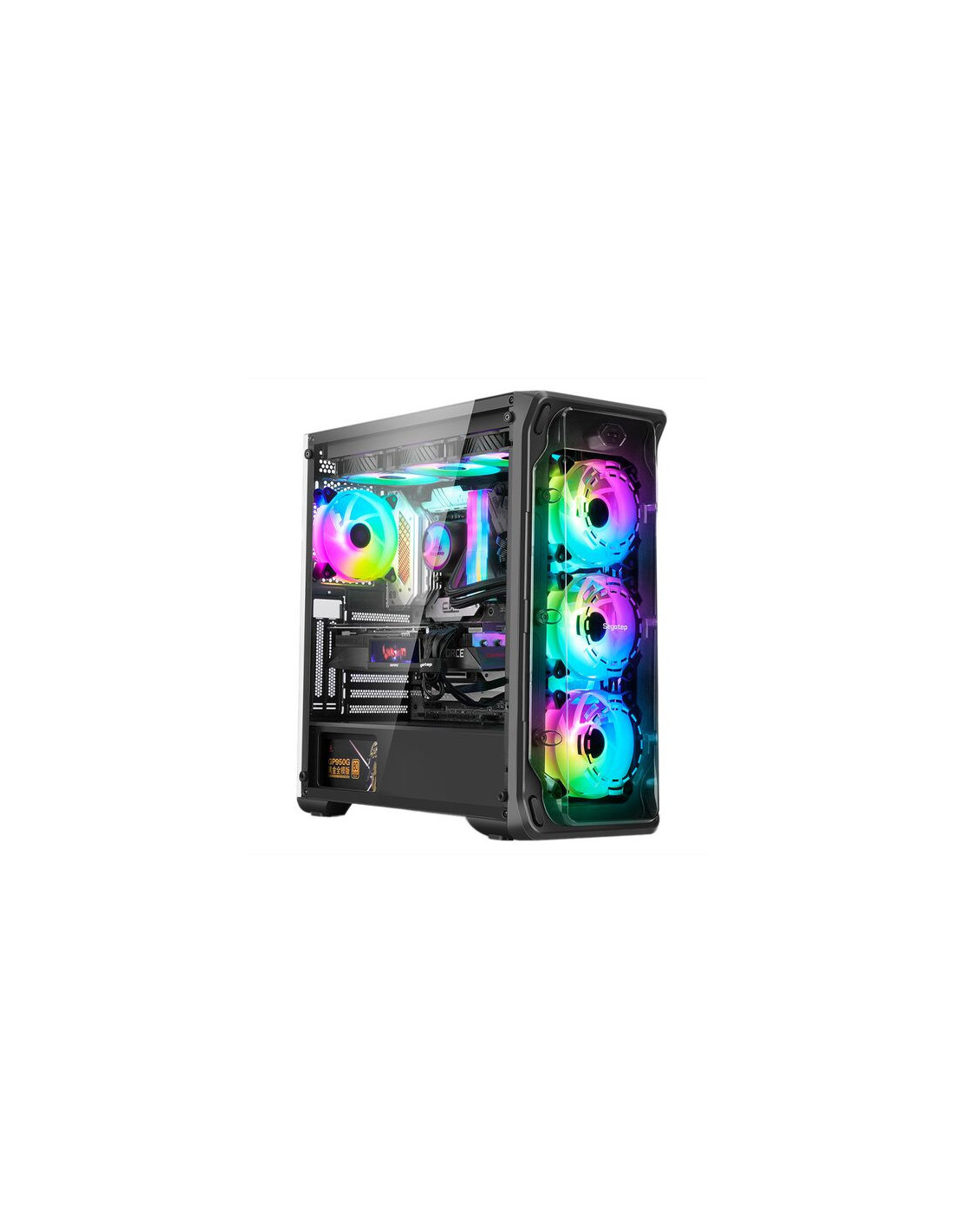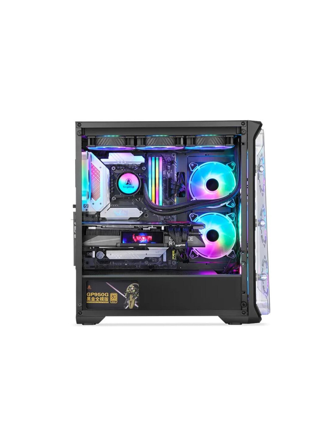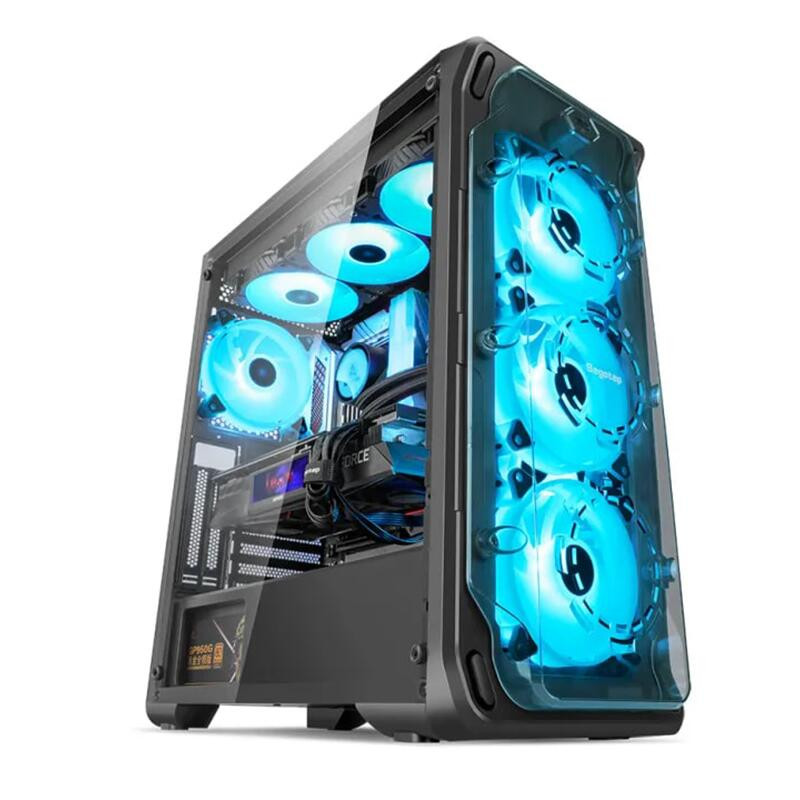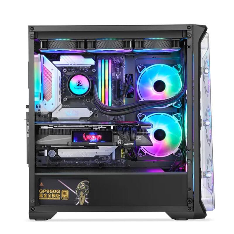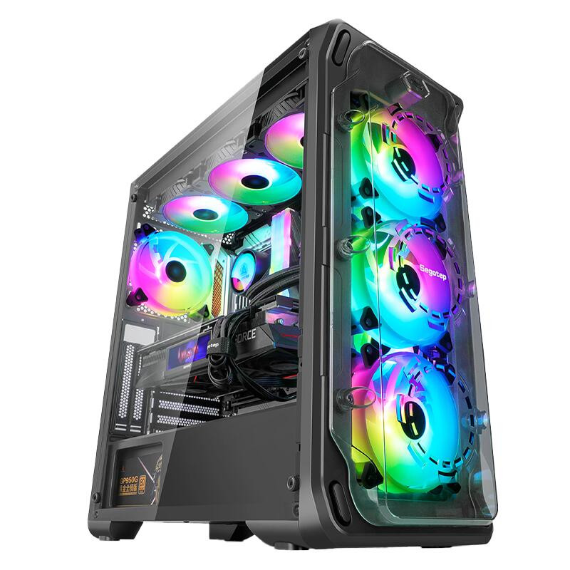 Carcasa Segotep Lux 360 neagra, SECC Steel ATX Mid Tower, fara sursa (tip ATX, montata jos), interior vopsit negru, 2x3.5” (intern) sau 1x 2.5” si 1x 3.5”, 2x2.5” (intern), fata – 3x 120mm aRGB LED fans (incluse) / 3x 140mm fan (optional), spate – 1x 120mm aRGB LED fan (inclus), tavan – 3x 120mm / 2x 140mm fans (optional), interior dreapta – 2x 120mm fans (optional), design premium cu panou lateral din sticla securizata, inlcude power cover, controller aRGB si telecomanda, 1x USB 3.0, 2x USB 2.0, HD Audio, E-ATX (305*330mm) ATX / microATX / Mini-ITX, sloturi expansiune: x7+2, inaltime maxima cooler procesor: 160mm, lungime maxima placa video: 390mm, dimensiuni: 482 x 210 x 410mm, greutate: 5.2kg