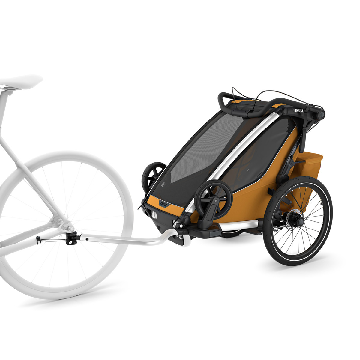 Sistemul Thule FlipWing - permite comutarea si mai usoara intre ciclism si plimbare si inapoi, acum cu posibilitatea de a rasturna rotile in sus si in jos in timp ce remorca este atasata la bicicleta