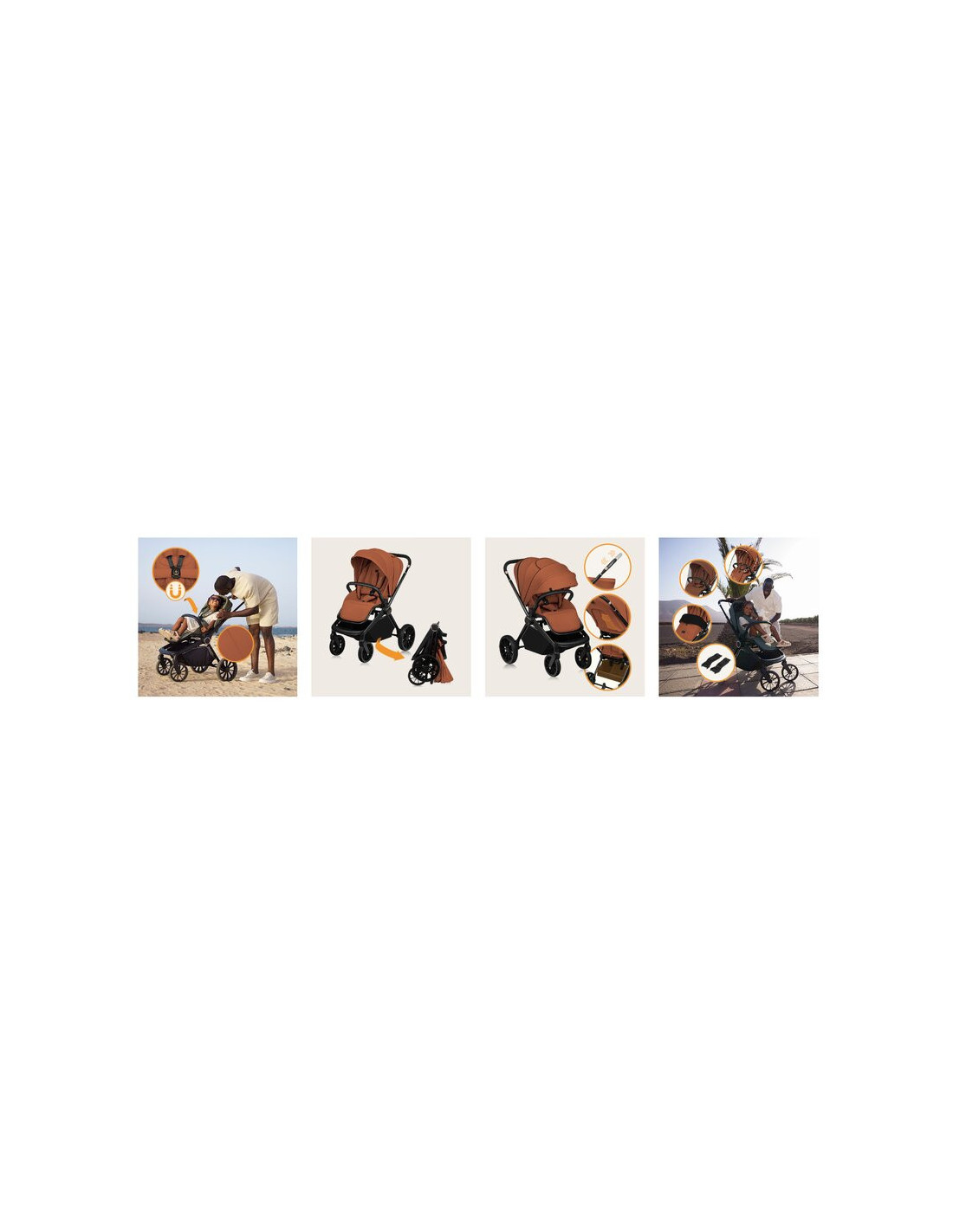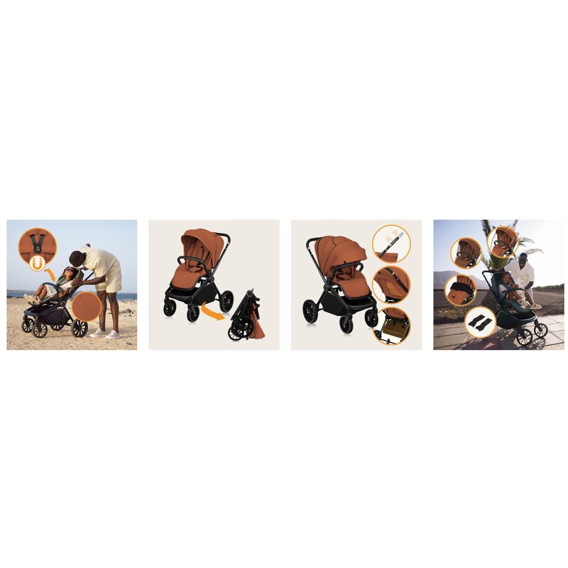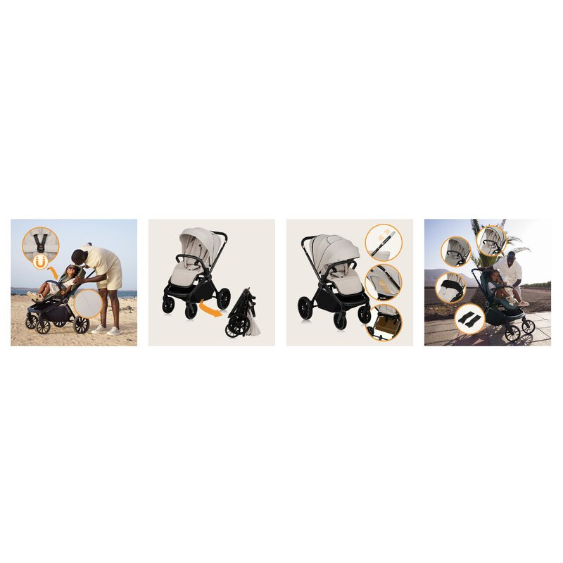 Setul include o plasa pentru tantari, o husa pentru picioare, o curea de transport si o husa de ploaie, pentru a asigura confort si comoditate in timpul plimbarilor, indiferent de vreme. Sunt disponibile, de asemenea, adaptoare pentru scaun auto (vandute separat), care permit atasarea usoara a acestuia la cadrul caruciorului.