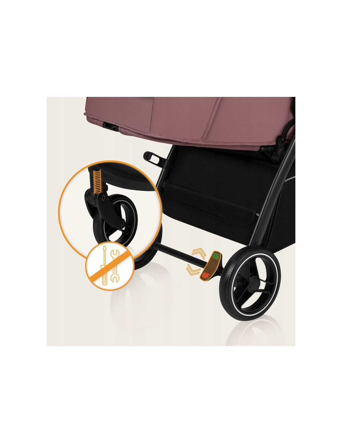 Rotile mari si fara intretinere din spuma EVA se caracterizeaza prin universalitate - sunt usoare si durabile in acelasi timp. Capacitatea de rotatie la 360_ face ca rotile sa fie foarte manevrabile si sa ofere posibilitatea de a manevra usor. Amortizarea dubla - plasata in fata si in spate - garanteaza confort chiar si in timpul traversarii denivelarilor. Caruciorul are frana centrala cu pedala si semnalizare.