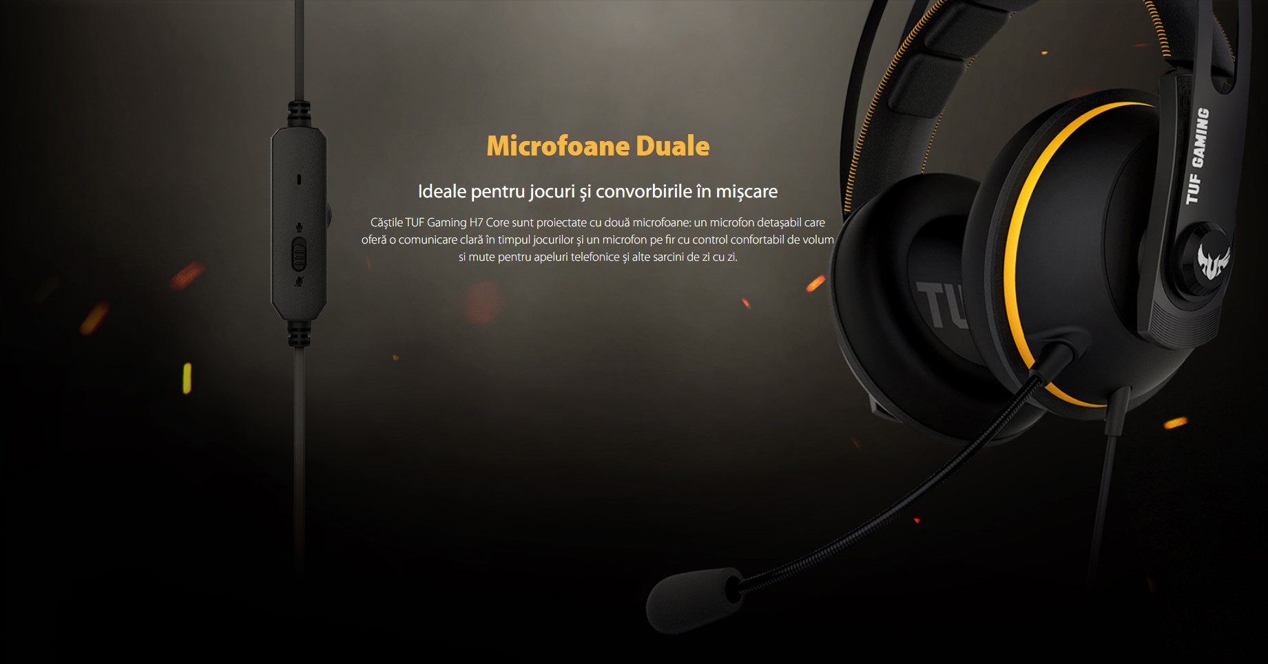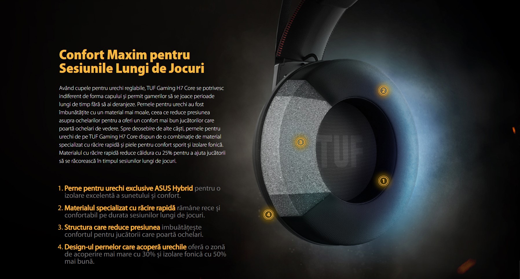 Casti Gaming ASUS TUF H7 Core, design ușor, pernițe pentru urechi îmbunătățite pentru confortul persoanelor care poartă ochelari, compatibilitate Win & OS, console pentru jocuri şi dispozitive mobile