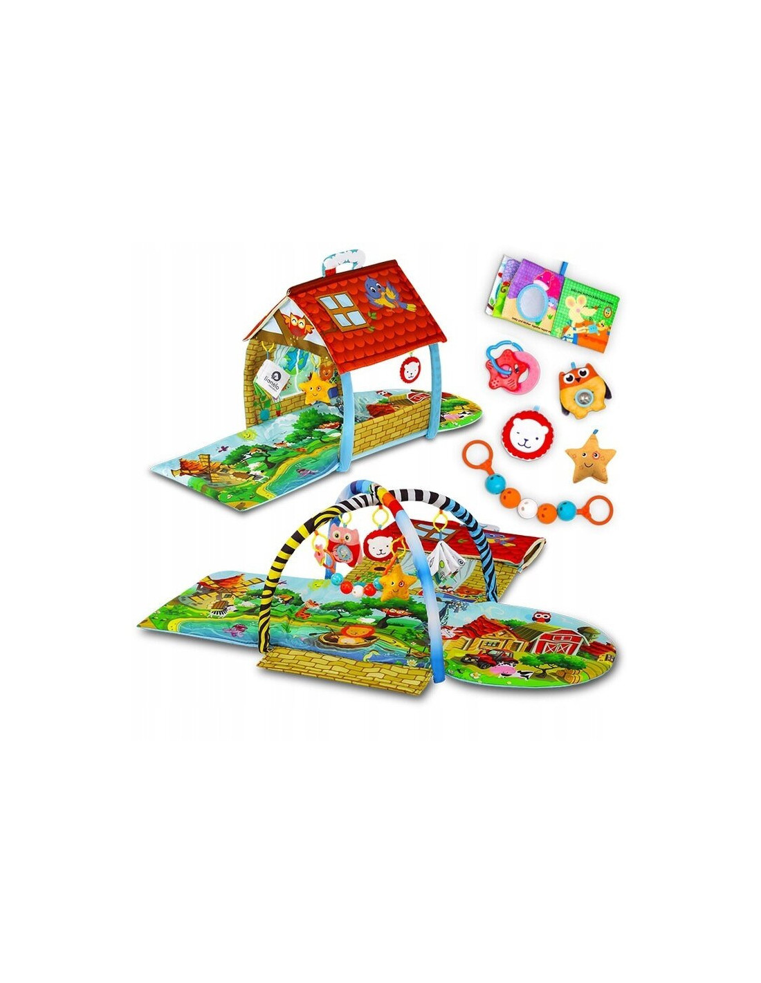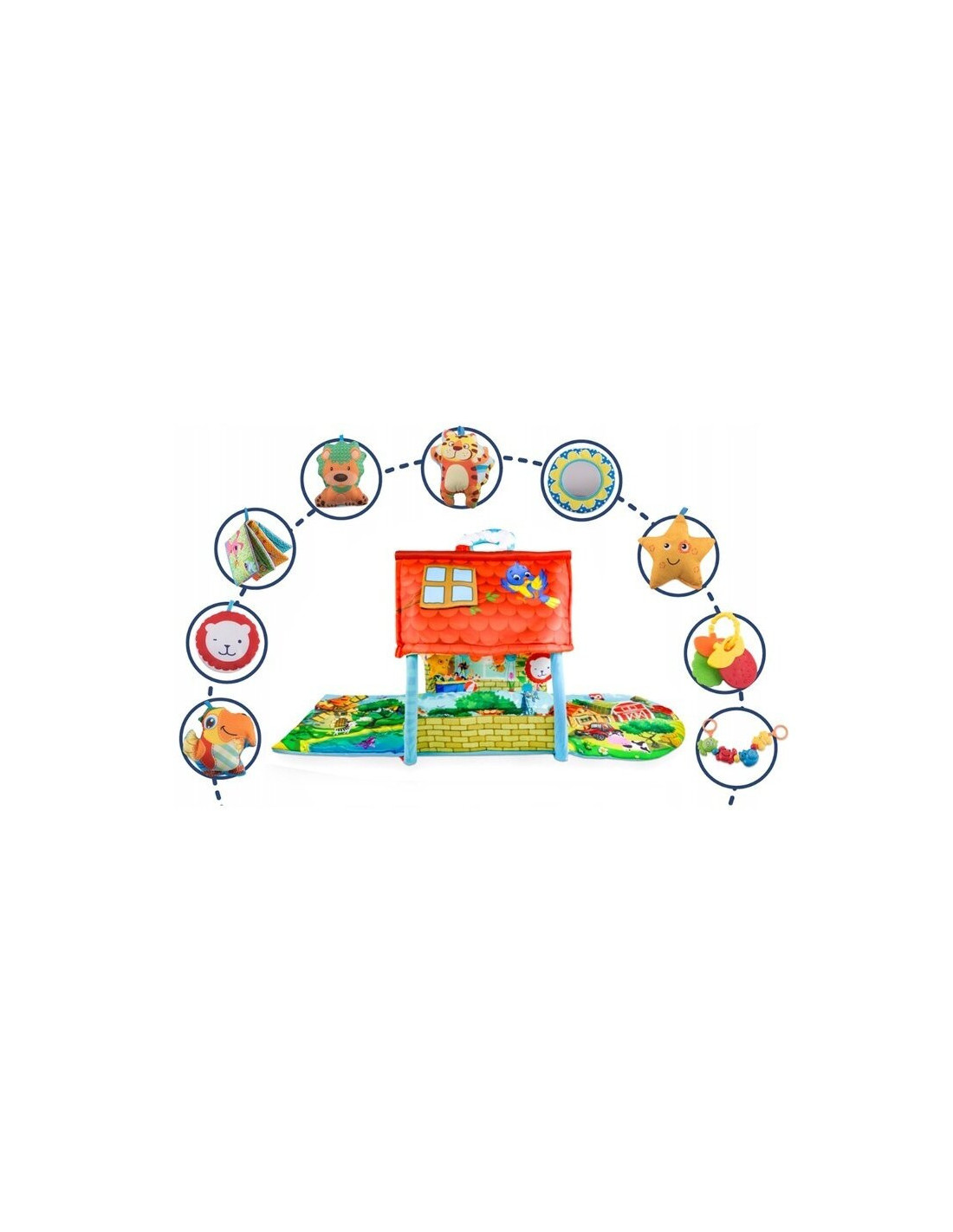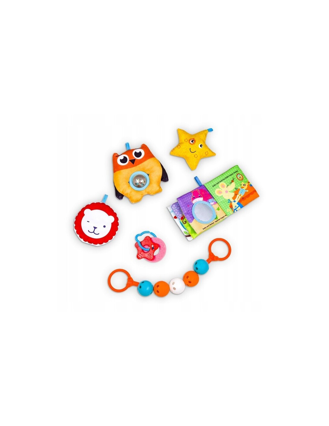 Setul bogat de jucarii include mascote care fosnesc si suna, o jucarie de dentitie, o carte interactiva si o franghie cu zgomot.