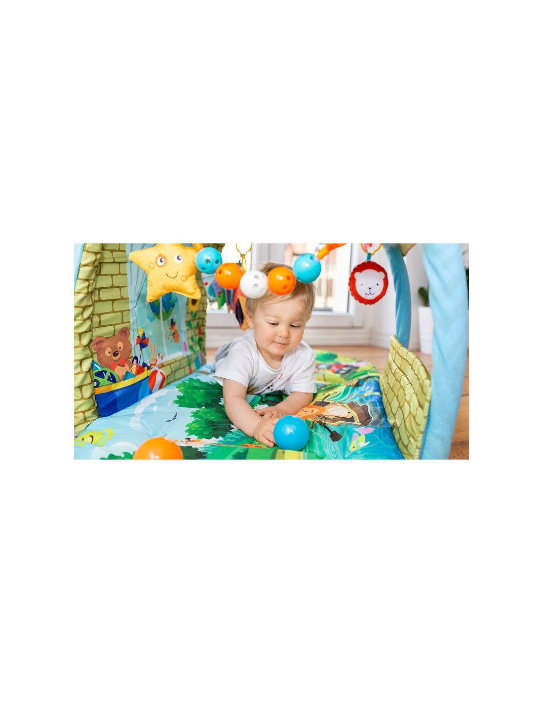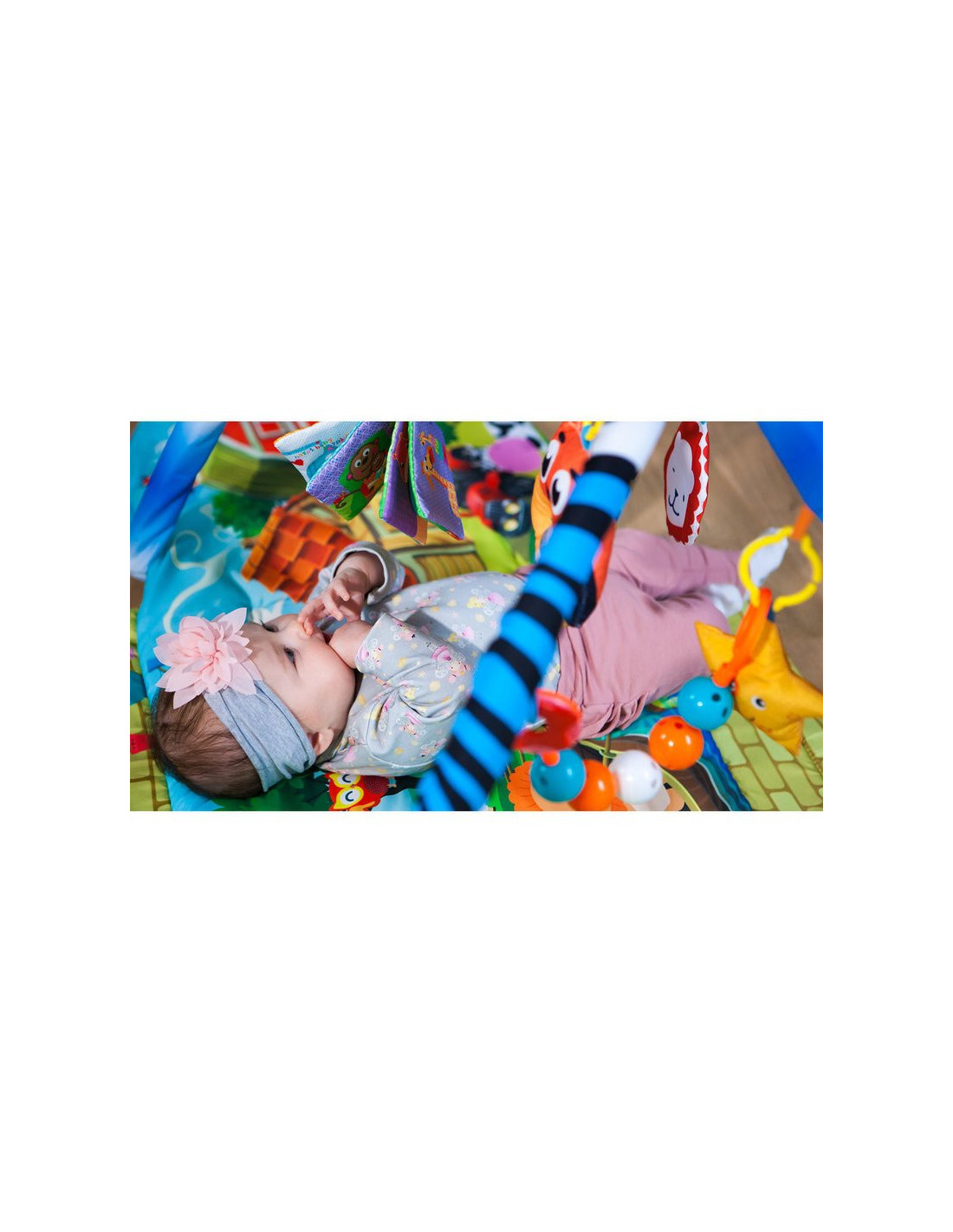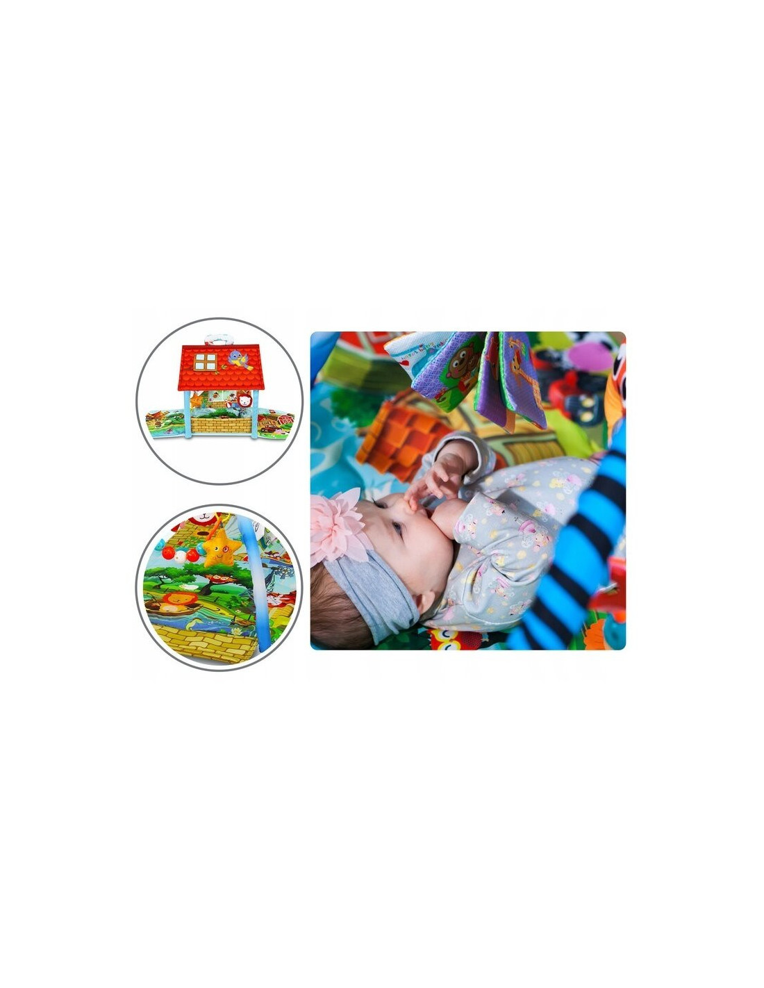 - Culorile intense stimuleaza simtul vederii, iar jucariile incurajeaza bebelusul sa fie activ si sa faca miscare, contribuind la dezvoltarea si intarirea muschilor.