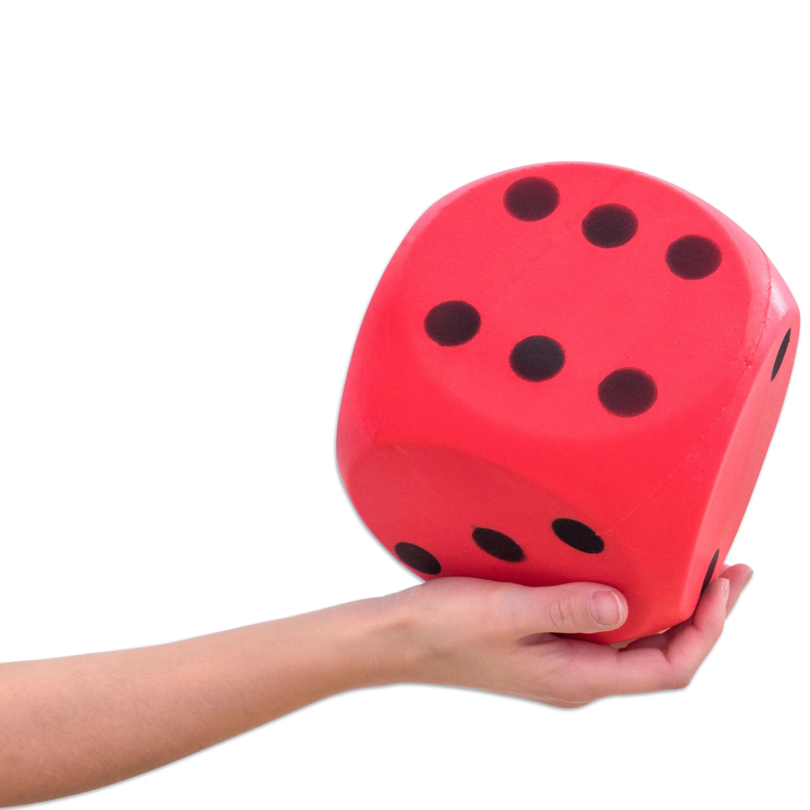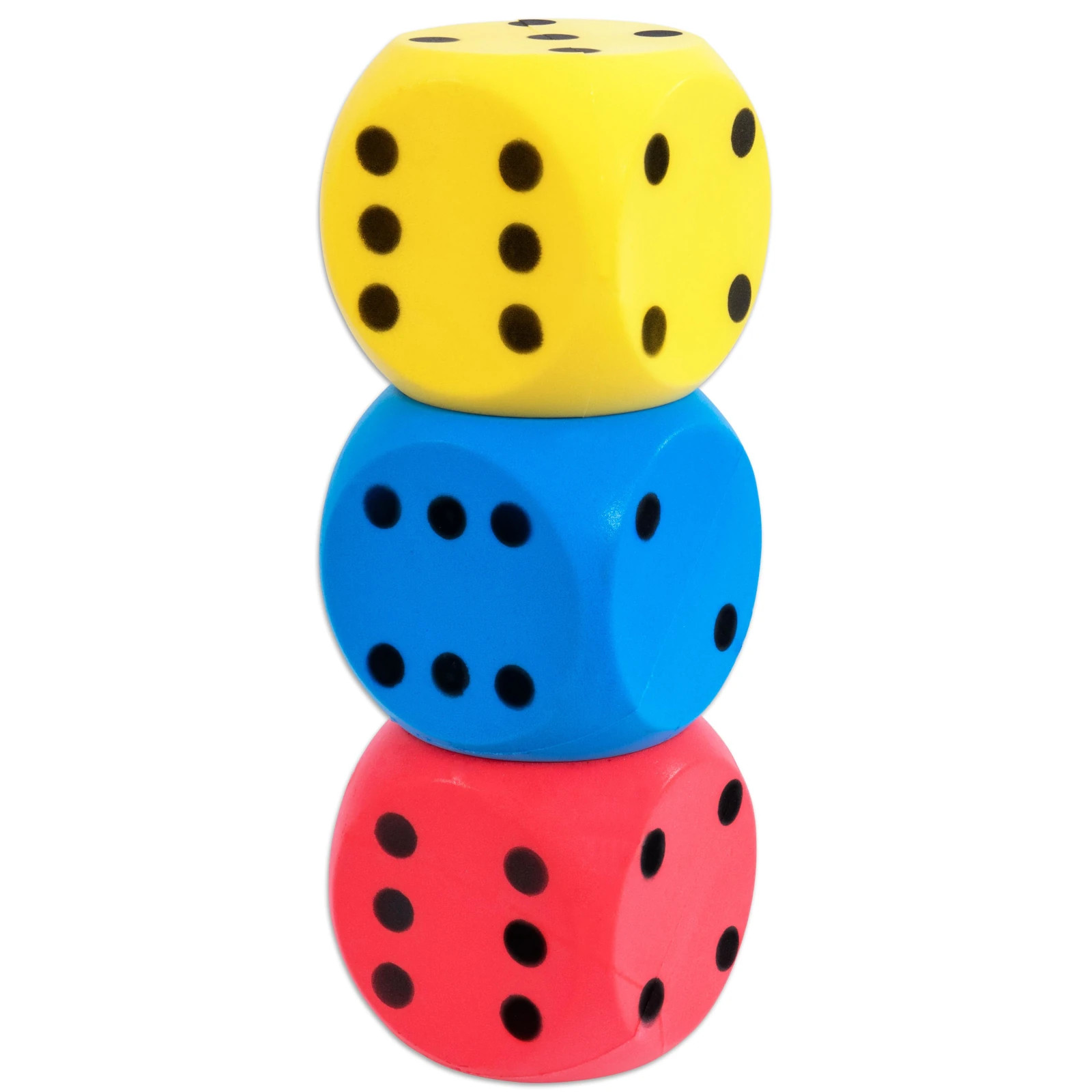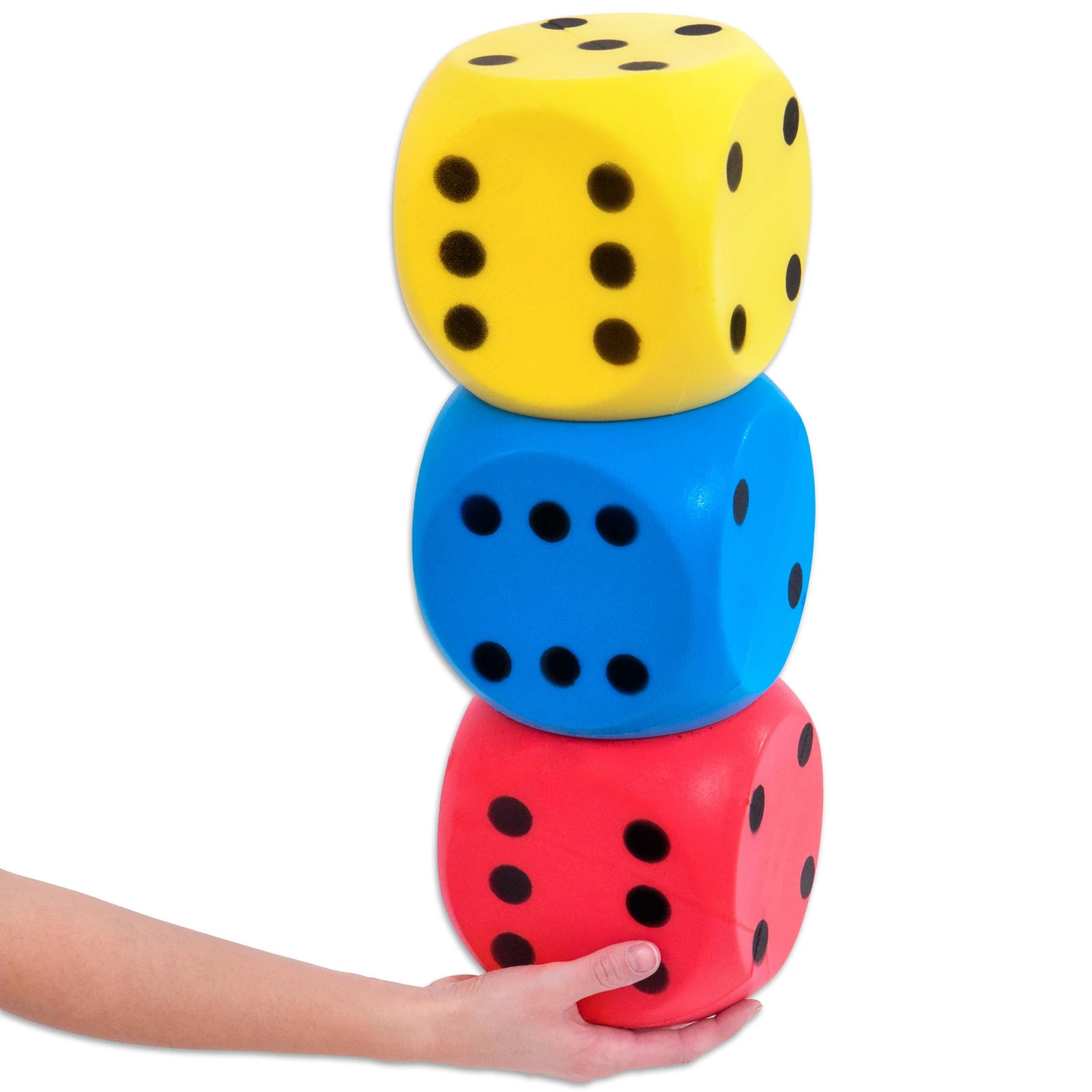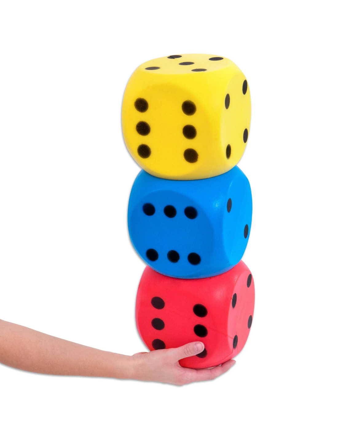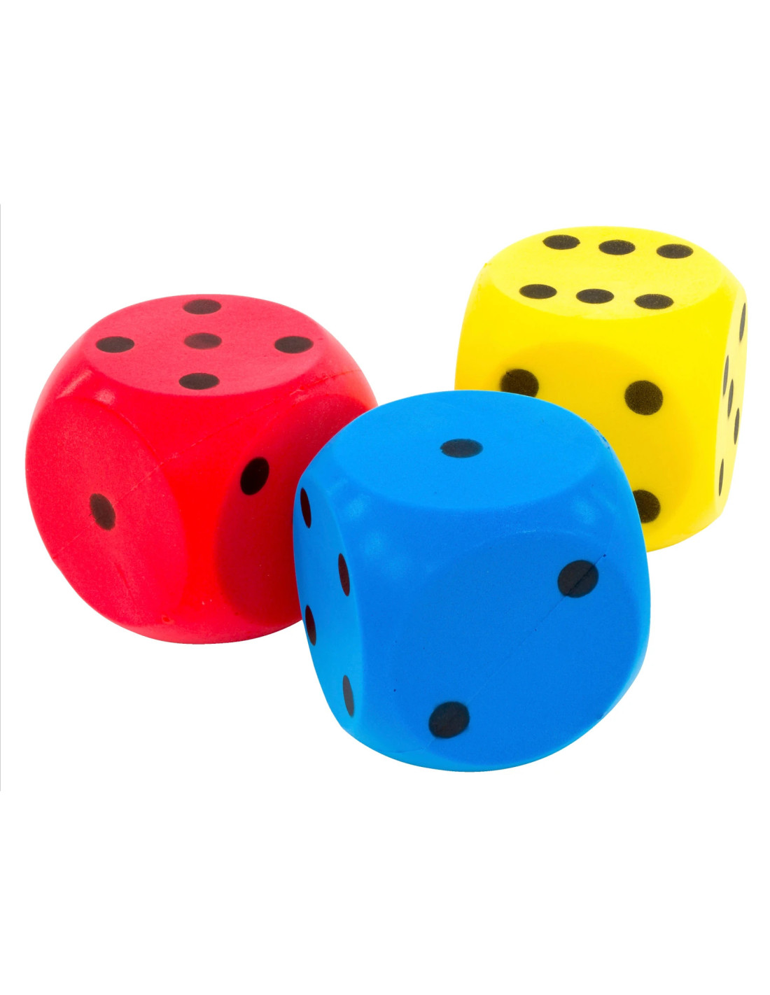 Set excelent cu 3 zaruri mari din spuma Setul cu 3 zaruri super moi din spuma integrala este ideal pentru orice tip de joc cu cuburi. In plus, sunt perfecte pentru a fi lovite, prinse si aruncate. Datorita dimensiunii lor de 16 cm, ele incurajeaza copiii sa vina cu idei noi de jocuri. Datorita materialului moale din spuma, toate ferestrele raman intacte, chiar daca aruncarea sau lovitura rateaza tinta. Utilizare oricand si oriunde Setul de zaruri din spuma poate fi utilizat atat in interior, cat si in exterior. Copiii pot face primele incercari de aruncare si prindere, iar datorita proprietatilor bune de saritura, sunt ideale si pentru primele jocuri de fotbal in picioarele goale. Pot fi folosite si ca sesiune de antrenament ludica, de exemplu: daca cubul aterizeaza pe 4 dupa lovire, persoana respectiva are 4 suturi la poarta gratuite. Continut : 3 cuburi neacoperite in culorile galben, albastru, rosu intr-o plasa practica Dimensiuni : latura cub 16 cm. Greutatea unui zar : aprox. 150 g Greutate totala: 450 g. Culori : albastru, galben, rosu. Material : spuma.