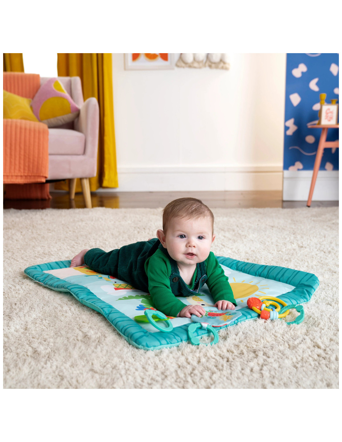 Transforma timpul pe burtica intr-o experienta distractiva cu Bright Starts Tiki Toy Bar, o salteluta vesela, plina de culori si jucarii interactive! Cu 3 moduri de joaca – pe burtica, intins sau in sezut – aceasta salteluta stimuleaza dezvoltarea motrica si simturile bebelusului. Arcada cu 3 jucarii detasabile si inele pentru atasarea jucariilor preferate ofera ore intregi de explorare si distractie. Usor de pliat si depozitat, este ideala atat acasa, cat si in calatorii. Material moale, lavabil la masina, pentru confort maxim!