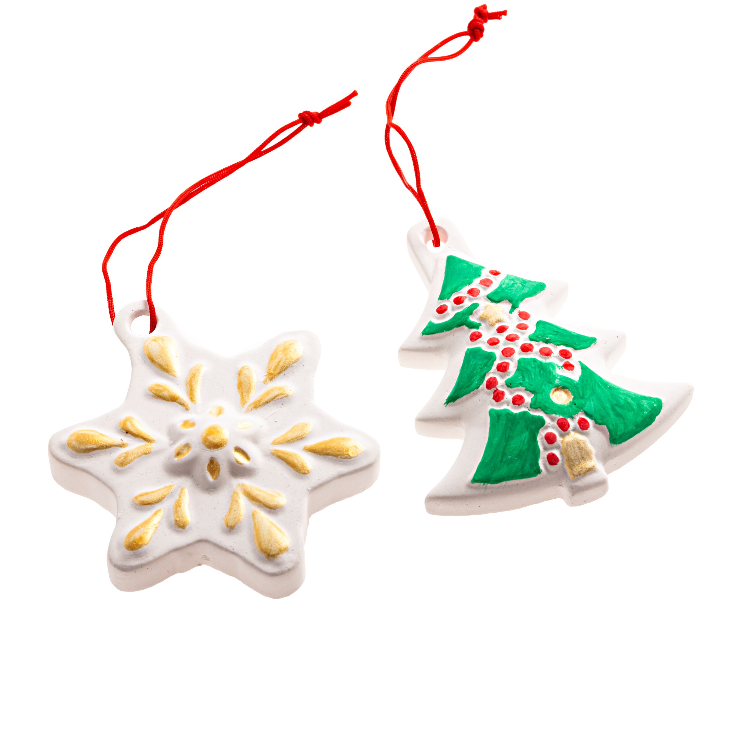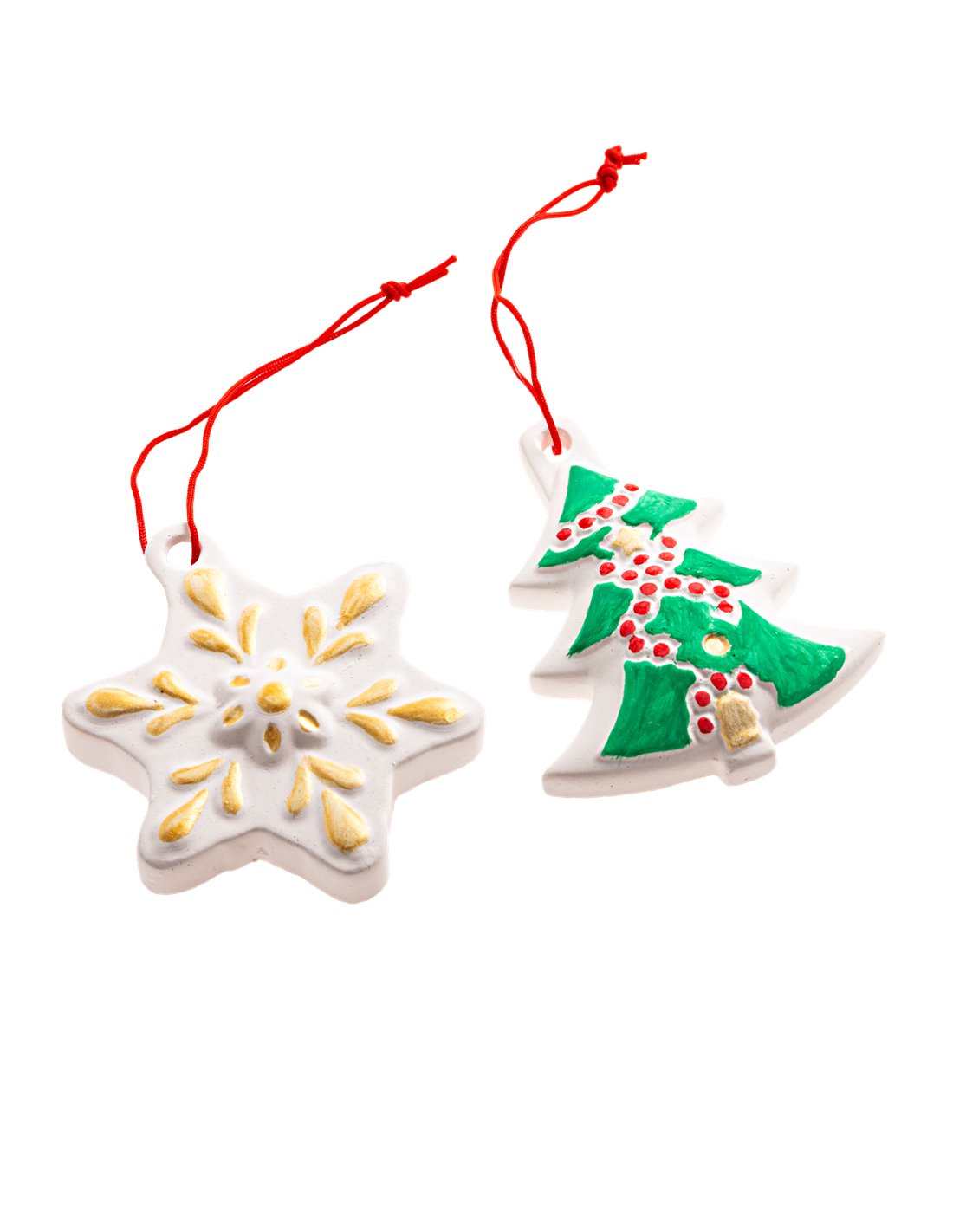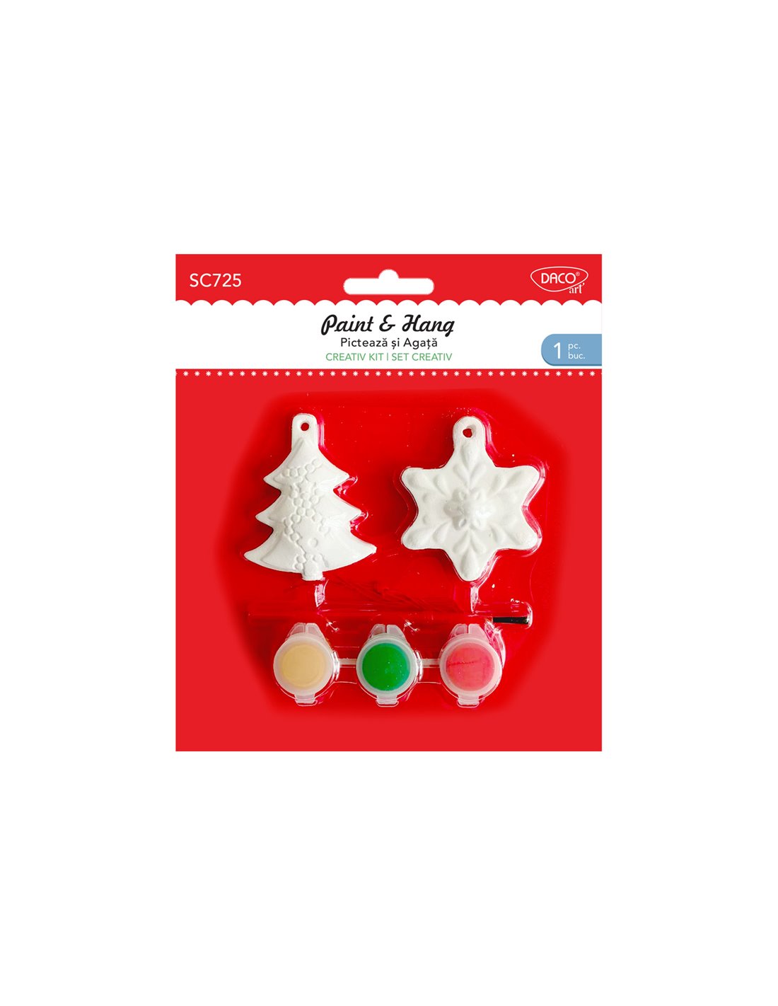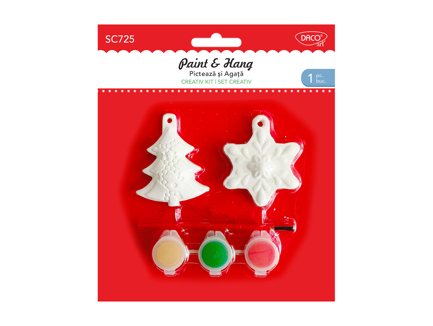 Piesele din ipsos – un brăduț și un fulg de nea – sunt ușor de pictat, având o lungime de 6,5 cm fiecare. Culorile incluse (auriu, roșu și verde) sunt special alese pentru tematica de Crăciun, iar pensula integrată este potrivită chiar și pentru mânuțele copiilor. După pictare, decorațiunile se pot agăța cu ajutorul celor două șnururi incluse în set.