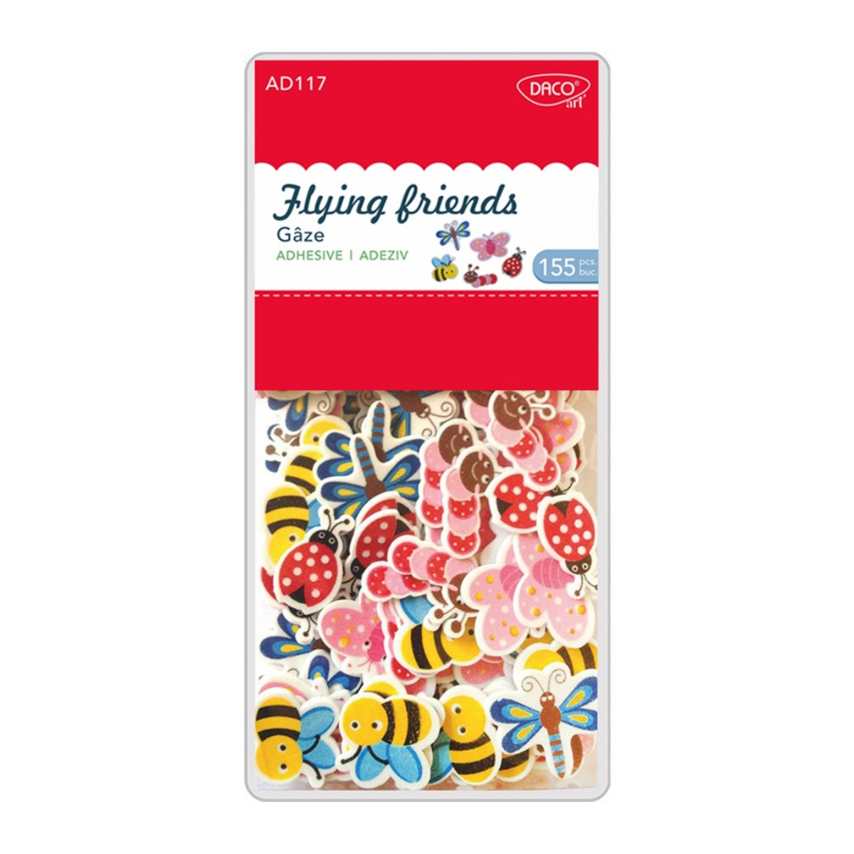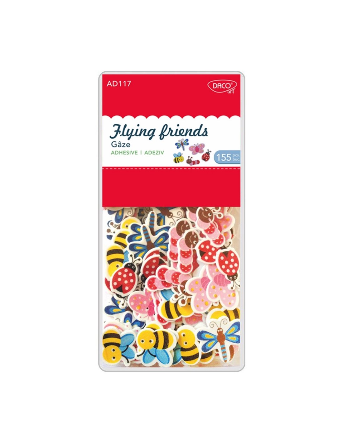 Setul decorativ Gâze DACO AD117 este ideal pentru activități de craft, proiecte handmade și creații artistice. Elementele decorative sunt realizate din spumă autoadezivă, fiind ușor de utilizat fără a necesita lipici suplimentar.