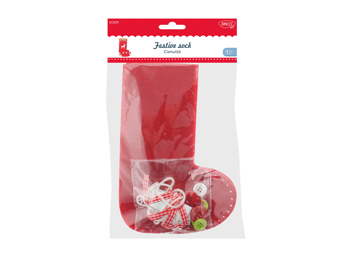 Setul Creativ DACO – Cizmulița este ideal pentru a adăuga un plus de farmec și personalitate decorurilor de Crăciun. Materialele incluse permit realizarea unei cizmulițe decorative din fetru, simplu de asamblat și perfectă pentru a înveseli casa în perioada sărbătorilor.