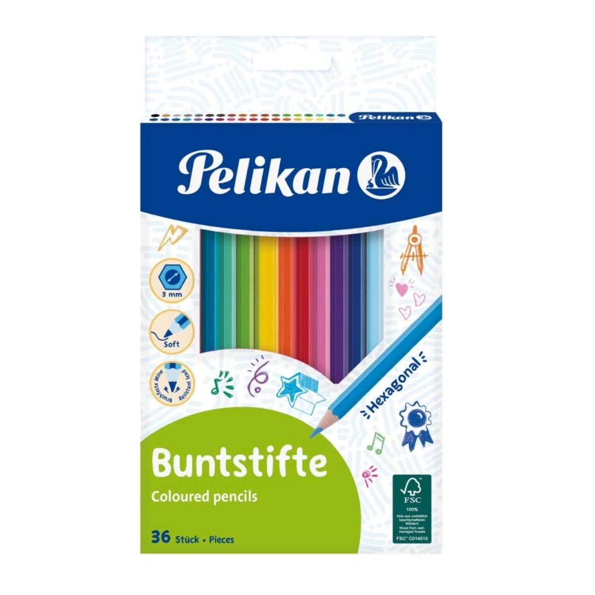 Cu Pelikan – Set 36 culori, secțiune hexagonală, fiecare desen prinde contur în mod expresiv, ordonat și colorat.