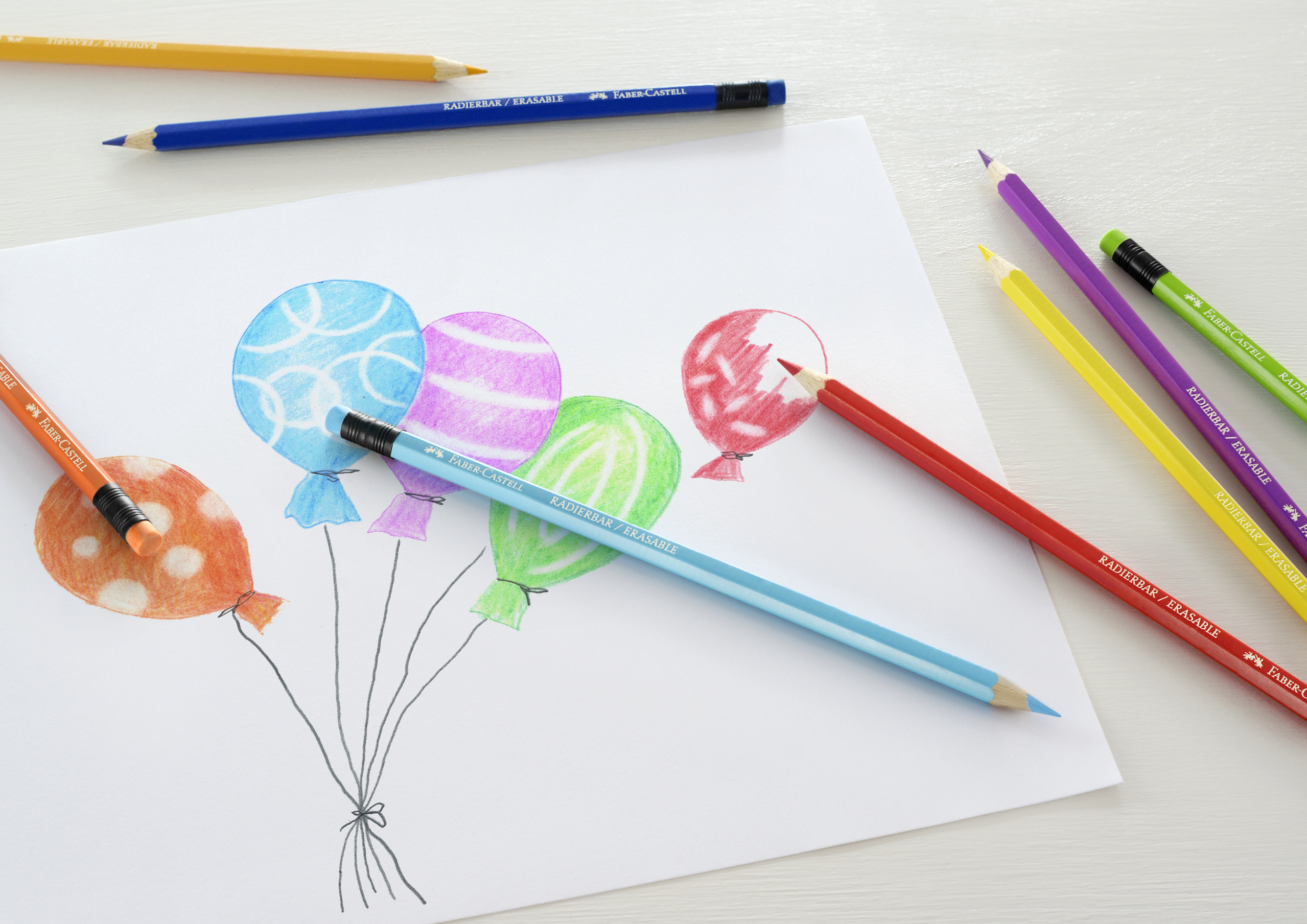 Creioanele au formă hexagonală clasică, ușor de ținut și controlat, iar culorile sunt luminoase și uniforme, aplicându-se fără efort. Guma integrată în capătul fiecărui creion este utilă pentru corecturi rapide, fiind perfect asortată cu nuanța scrisului.