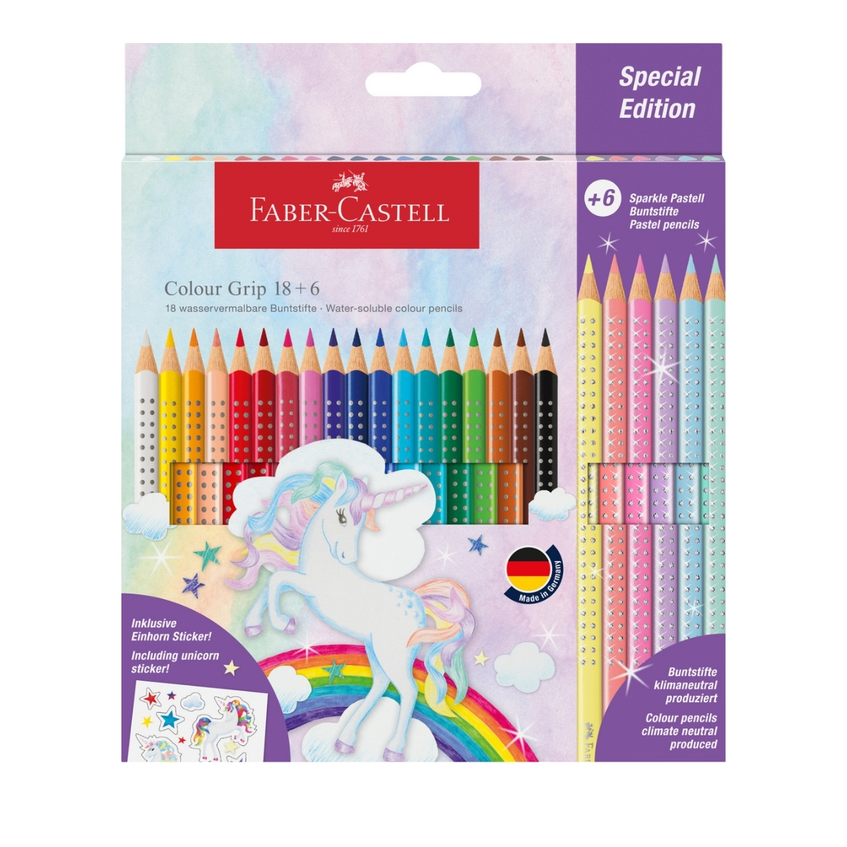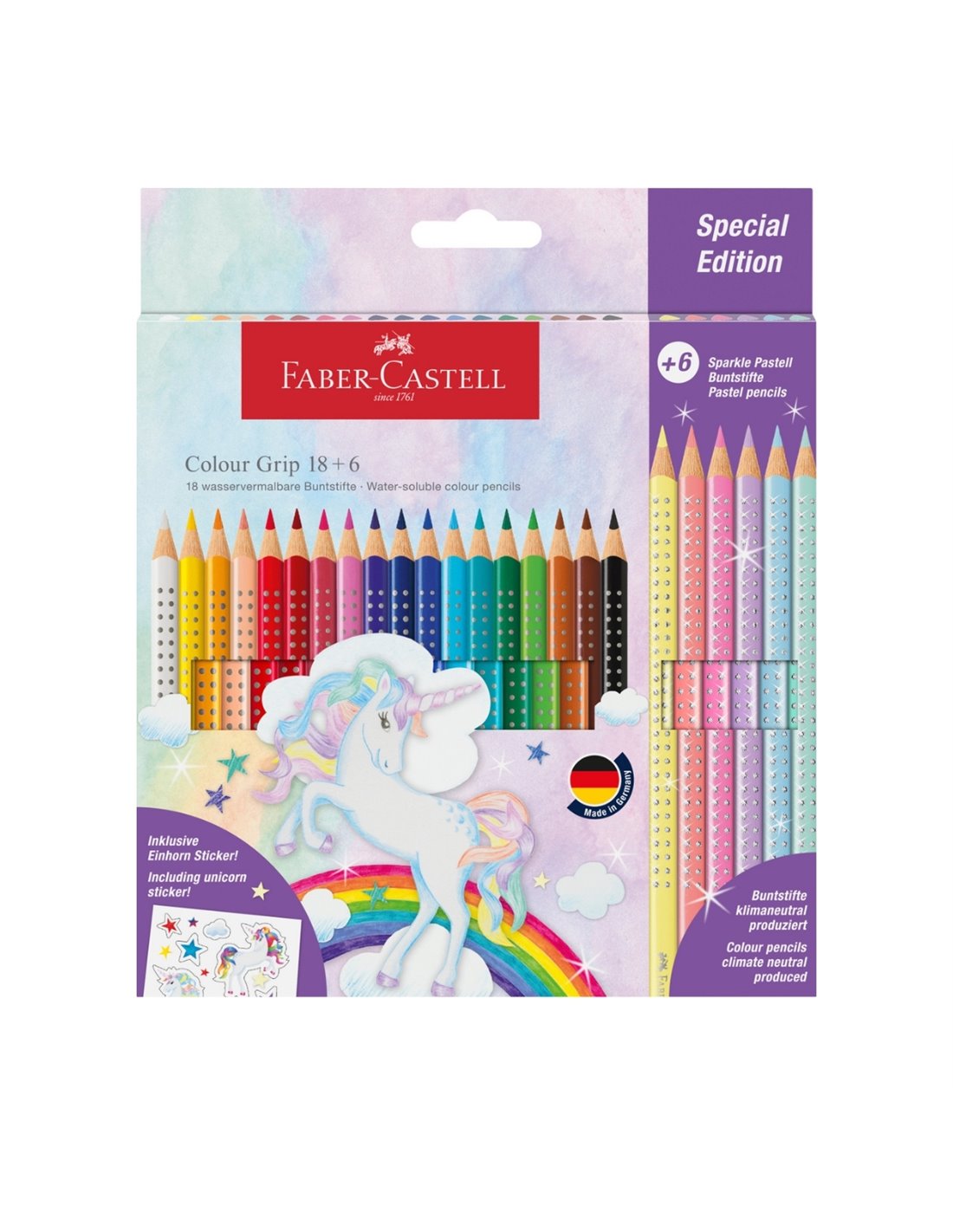 Set promo creioane colorate Faber-Castell FC201543, 18+6 culori grip 2001, Unicorni