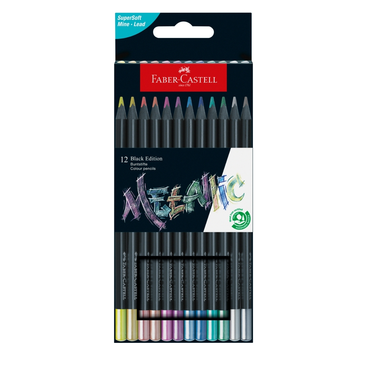 • Faber-Castell FC116415 Black Edition – 12 creioane colorate metalizate premium