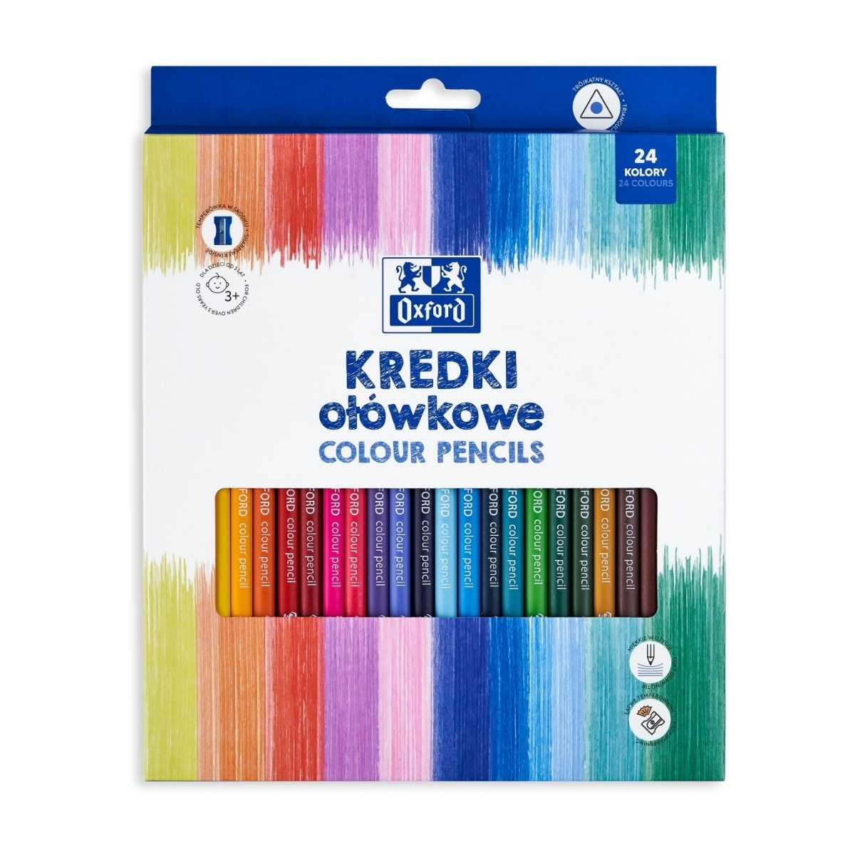 Creioane colorate triunghiulare Oxford, set 24 + ascutitoare, include auriu, in cutie de carton