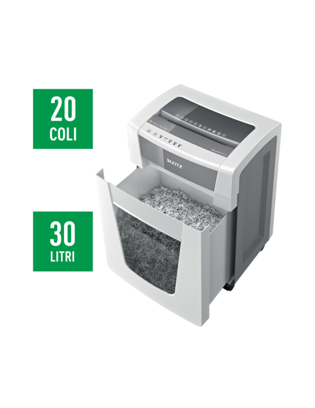 Distruge 20 coli de hartie A4, tipul de taiere este cross cut (confeti), intr-un cos generos de 30L, operatiuni simple folosind displayul touch.