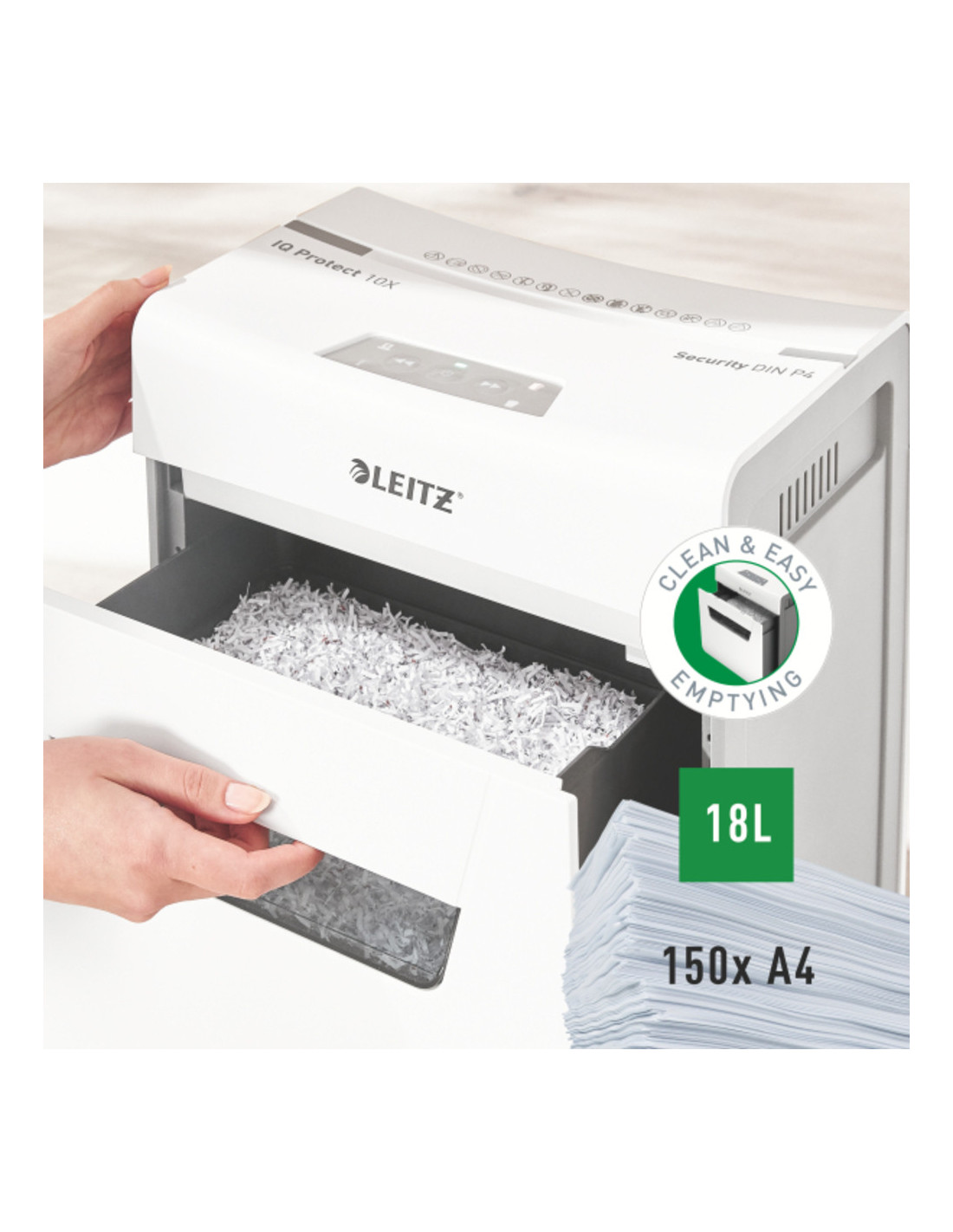 Displayul Touch este intuitv si usor de folosit, permitand ditrugerea a 10 coli A4 odata. Distrugatorul Leitz IQ Protect, avand nivel de securitate P4 cross cut, asigura protectie documentelor tale si imbunatateste camera sau biroul prin designul elegant.