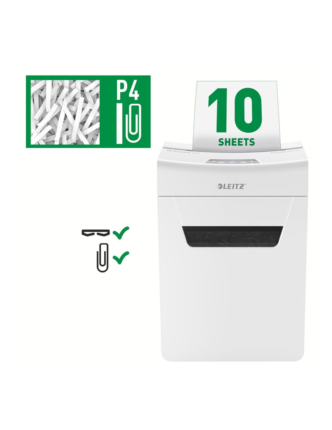 Distrugator documente manual LEITZ IQ Protect 10X, P4, cross-cut (confeti), 10 coli, cos 18l, alb