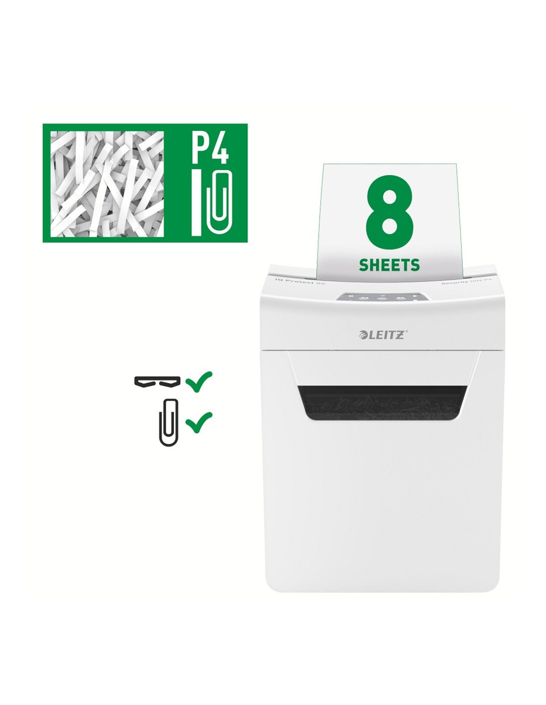 Distrugator documente manual LEITZ IQ Protect 8X, P4, cross-cut (confeti), 8 coli, cos 14l, alb