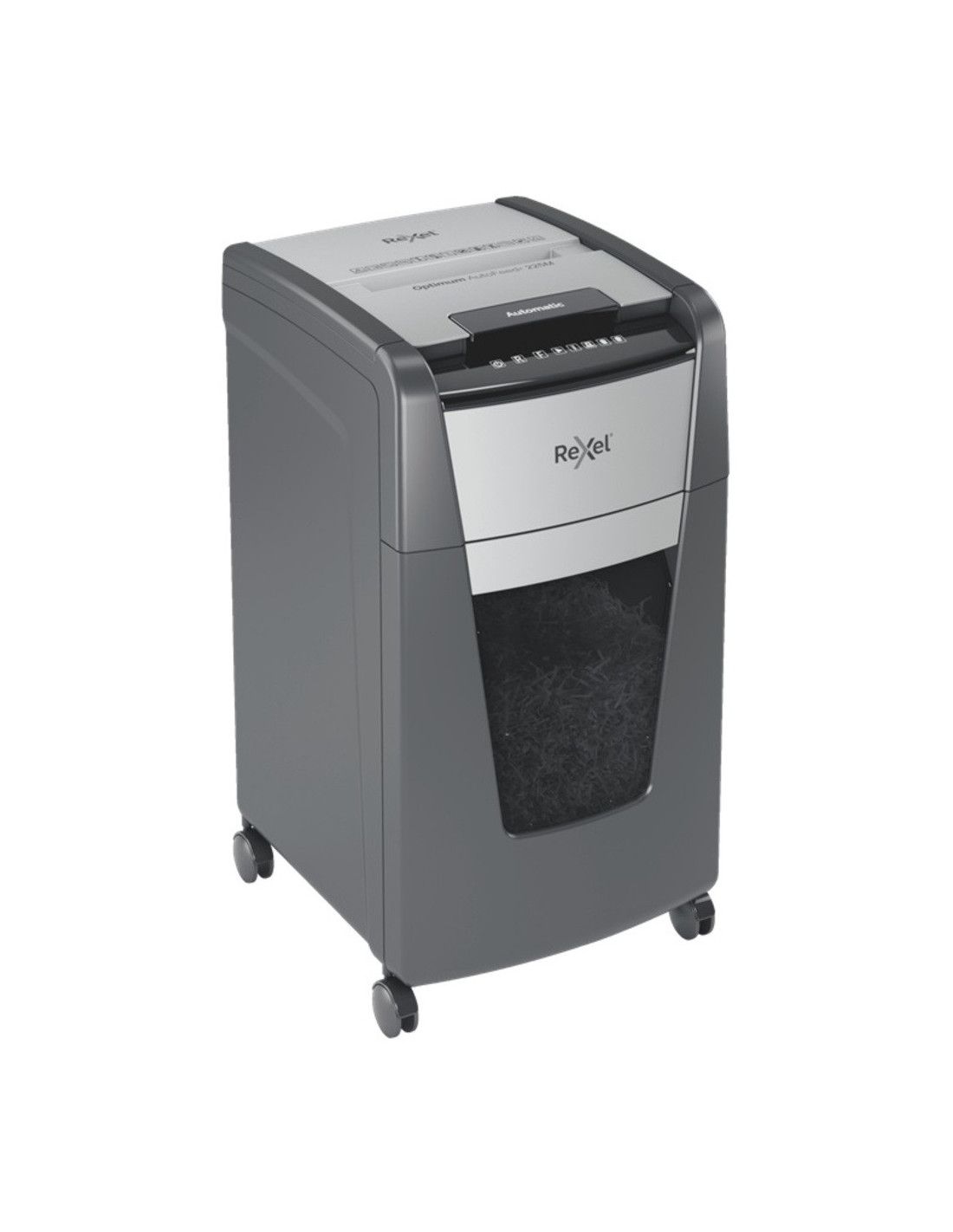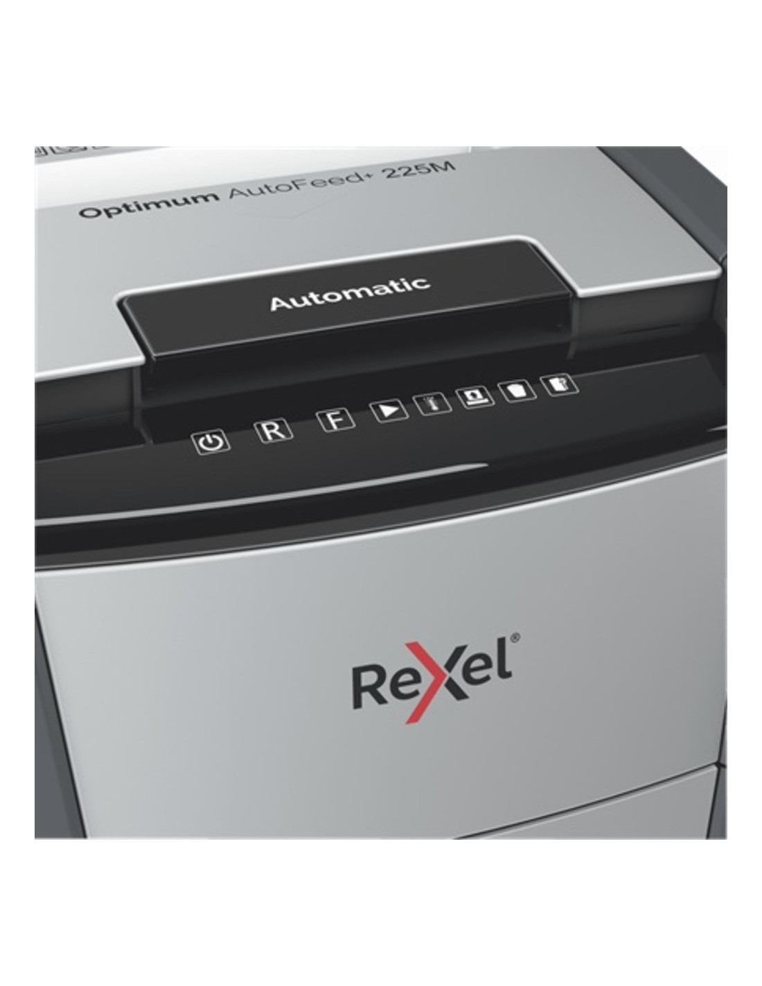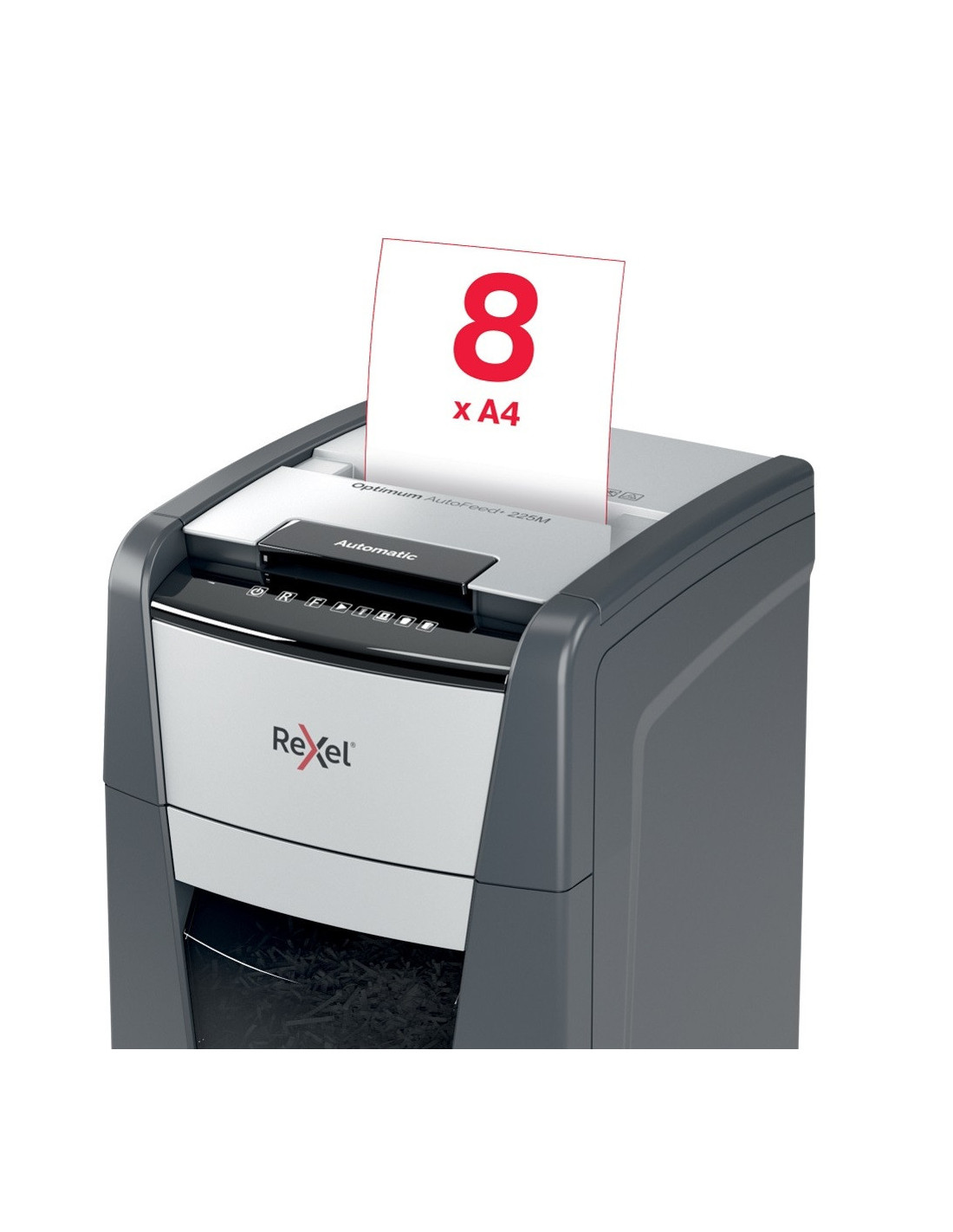 Distrugatorul automat pentru documente Rexel Optimum AutoFeed+ 225M distruge automat 225 coli A4 (80 gsm) dintr-o singura incarcare, in bucati de 2x15 mm (P-5, micro cut).