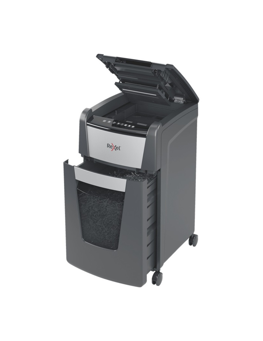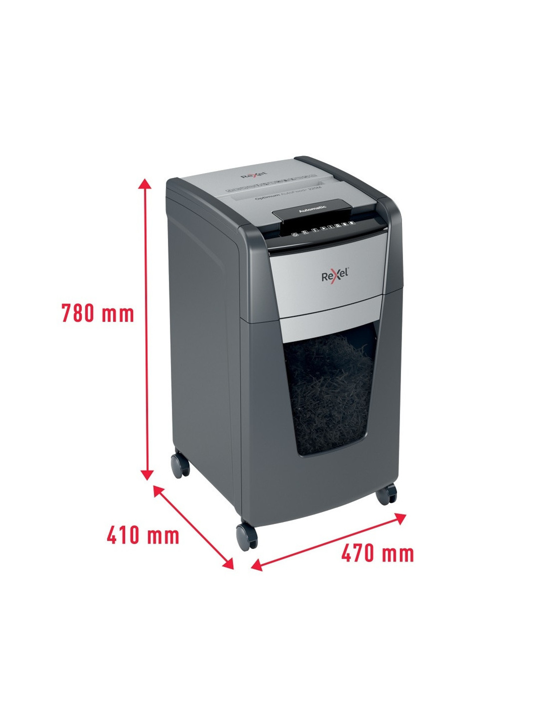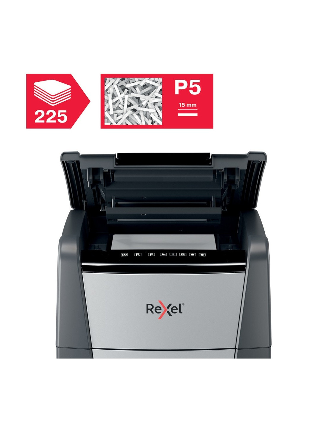 Distrugatorul automat pentru documente Rexel Optimum AutoFeed+ 225M distruge automat 225 coli A4 (80 gsm) dintr-o singura incarcare, in bucati de 2x15 mm (P-5, micro cut).