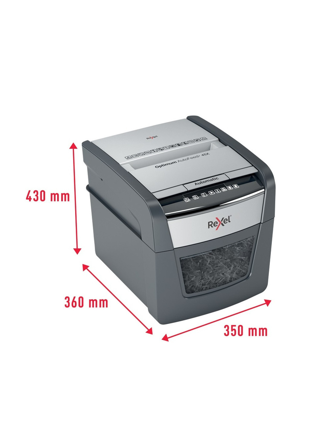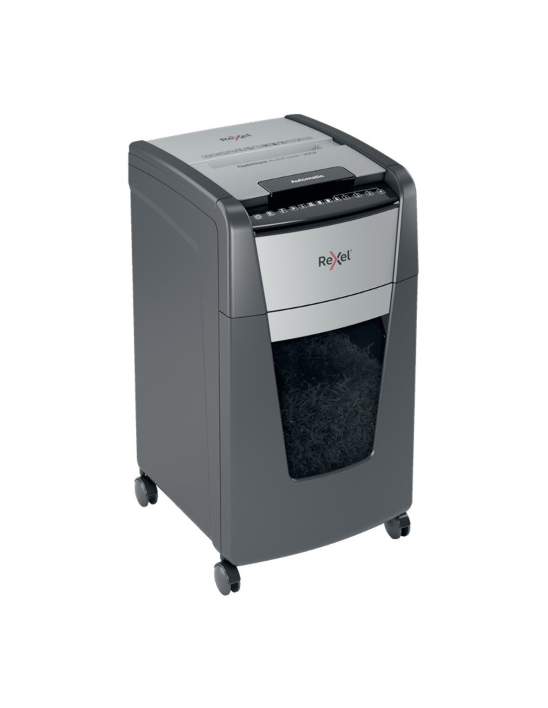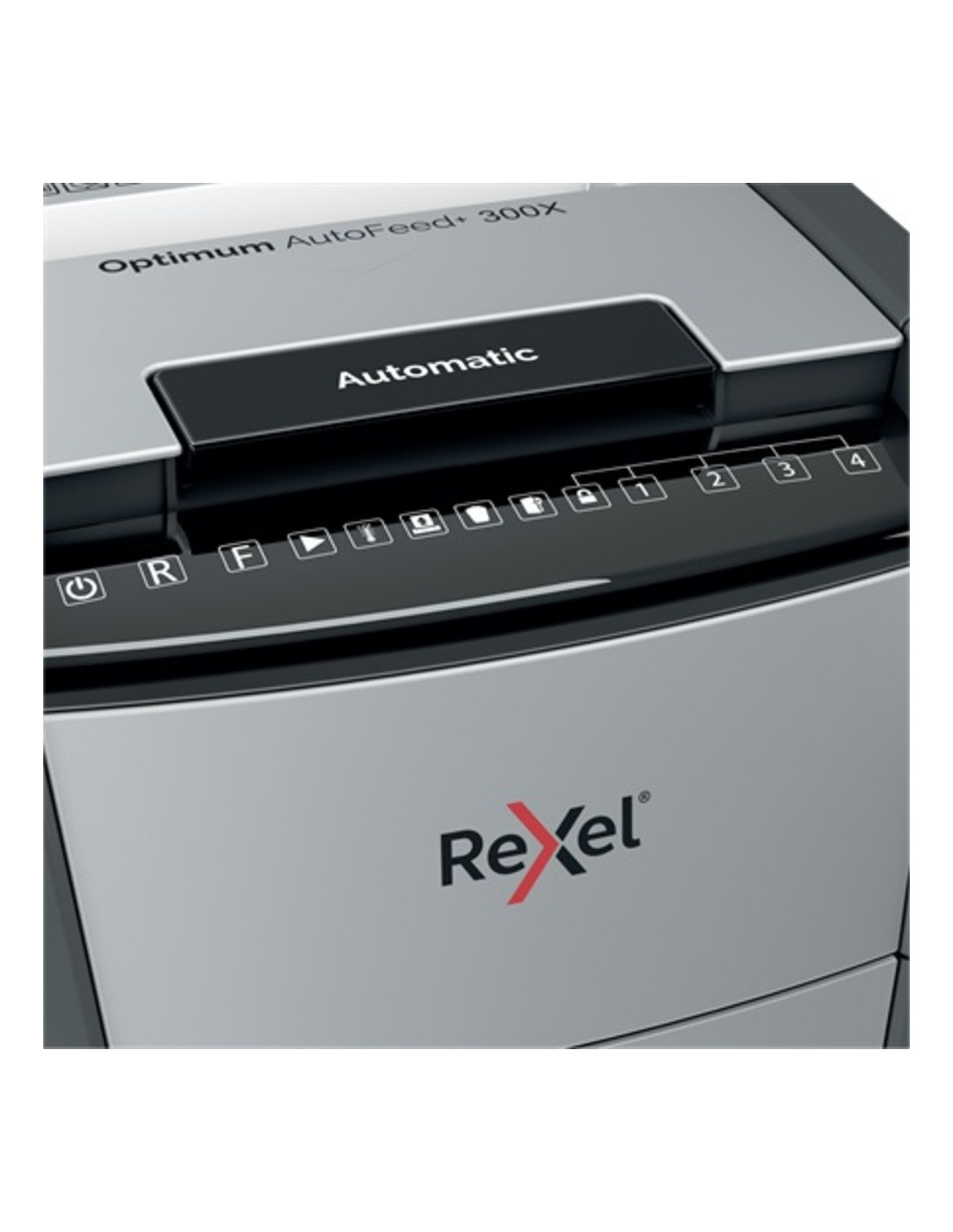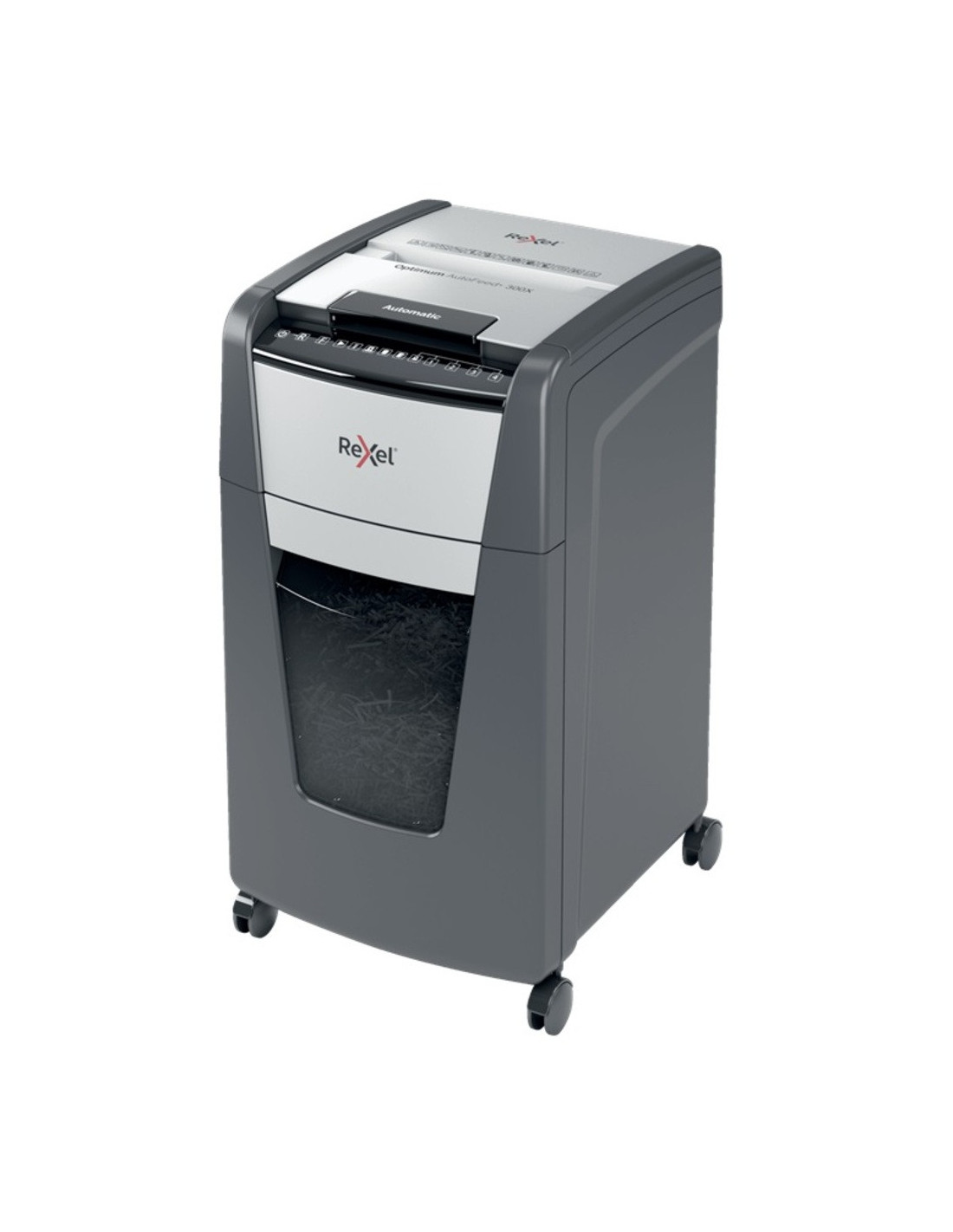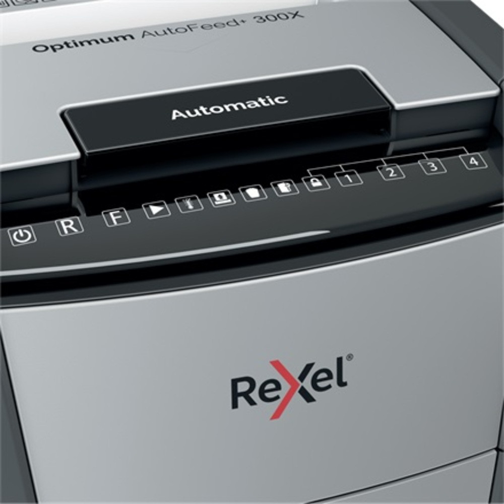 Distrugatorul automat pentru documente Rexel Optimum AutoFeed+ 300X distruge automat 300 coli A4 (80 gsm) dintr-o singura incarcare, in bucati de 4x26 mm (P-4, cross cut).