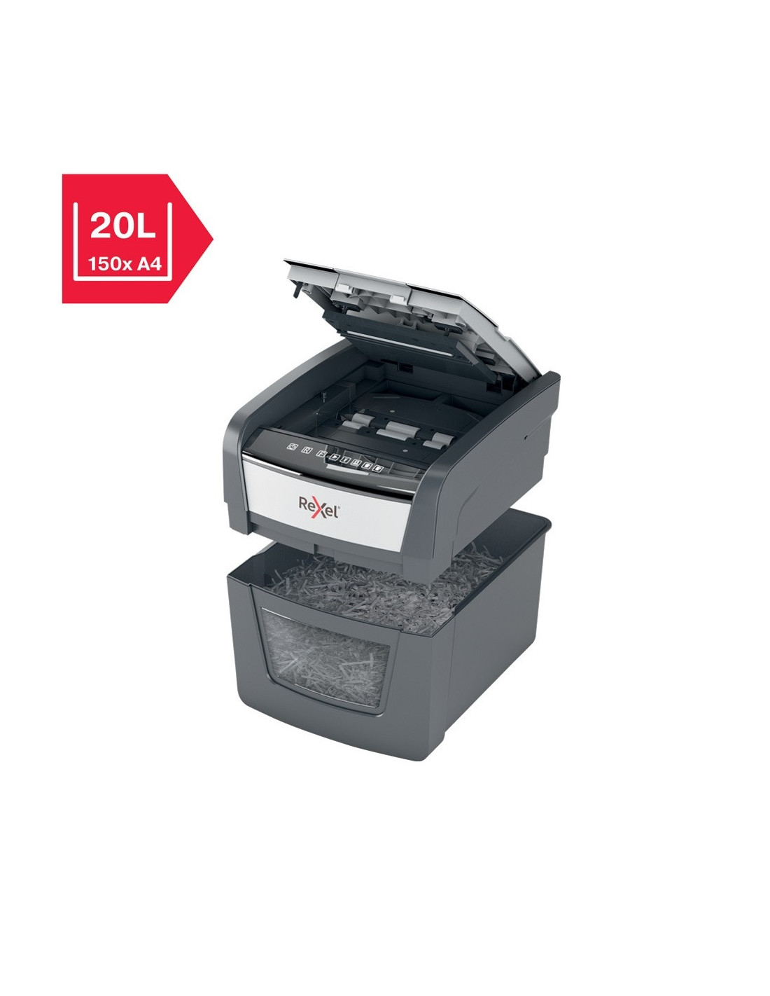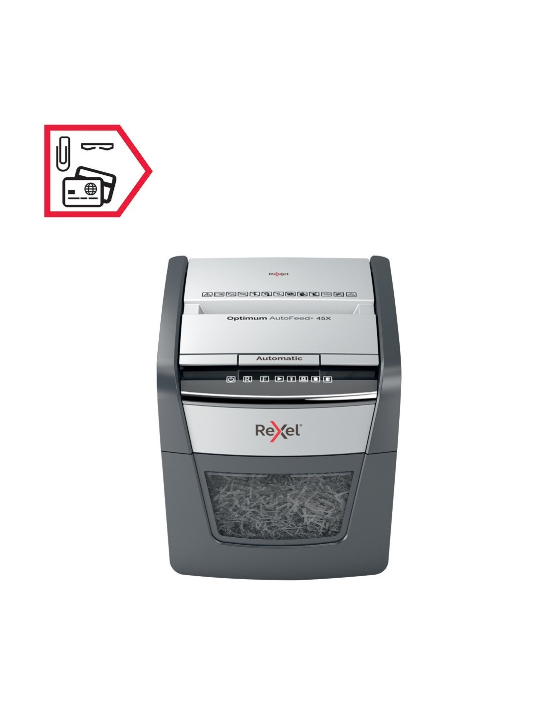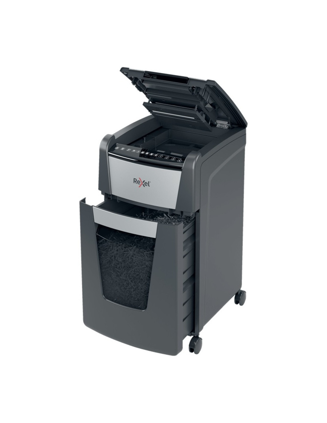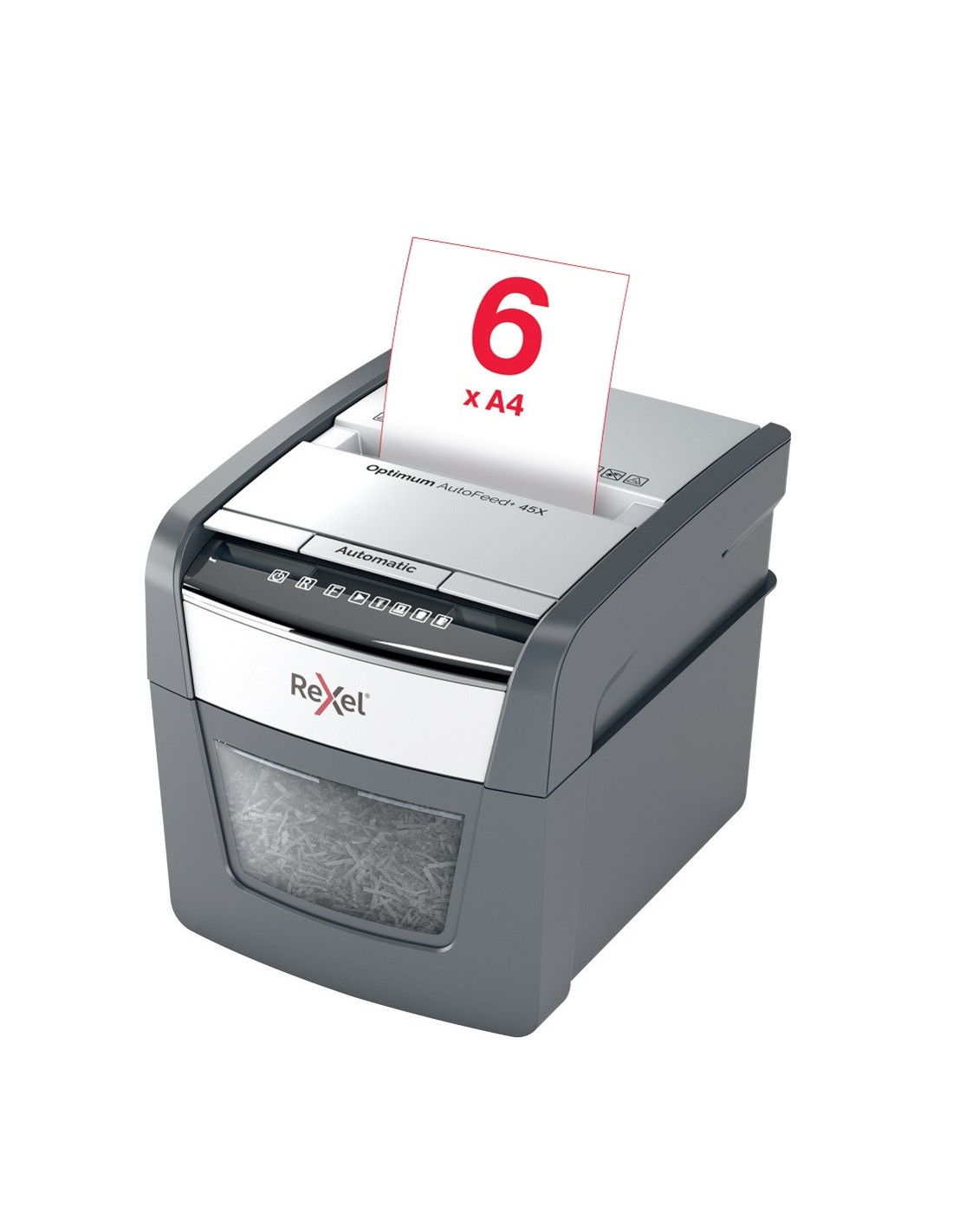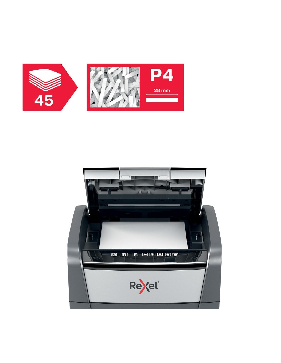 Distrugatorul automat pentru documente Rexel Optimum AutoFeed+ 300X distruge automat 300 coli A4 (80 gsm) dintr-o singura incarcare, in bucati de 4x26 mm (P-4, cross cut).