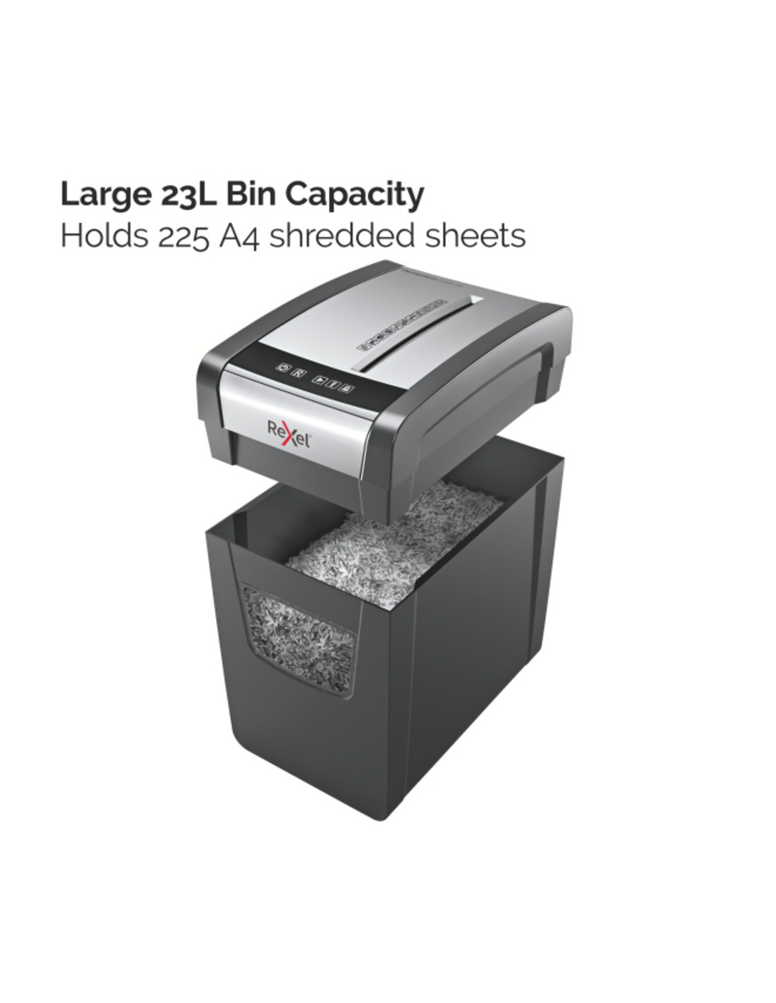 Butoanele touch intuitive asigură o utilizare simplă, iar funcționarea silențioasă minimizează perturbările în mediul de lucru. Coșul de 23 L poate depozita până la 225 de coli mărunțite, reducând frecvența golirilor.