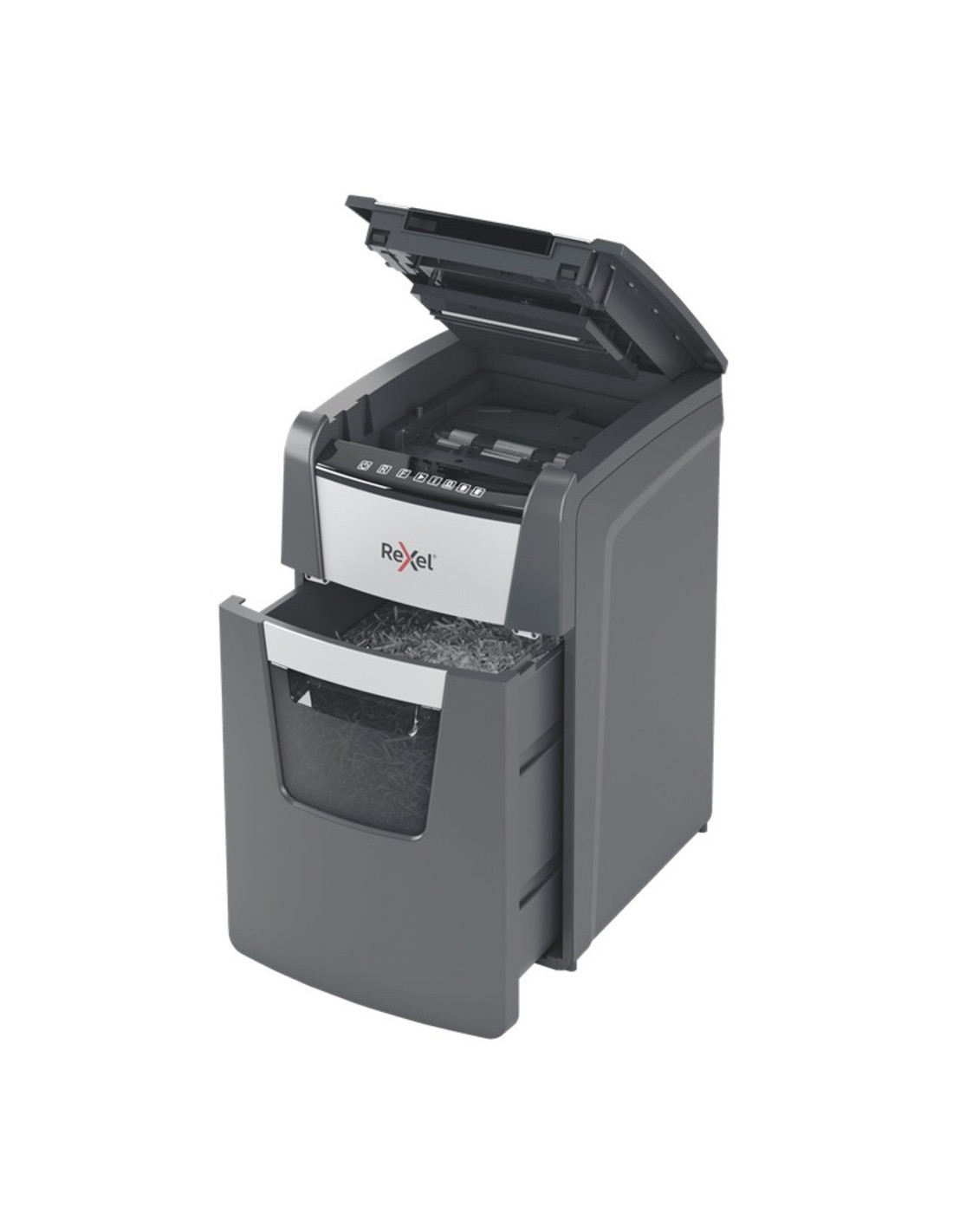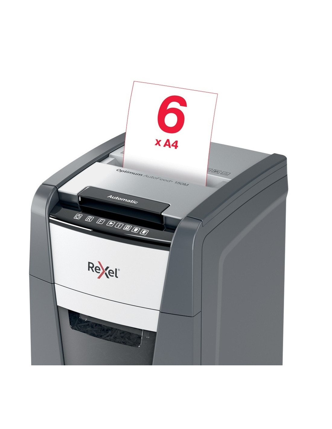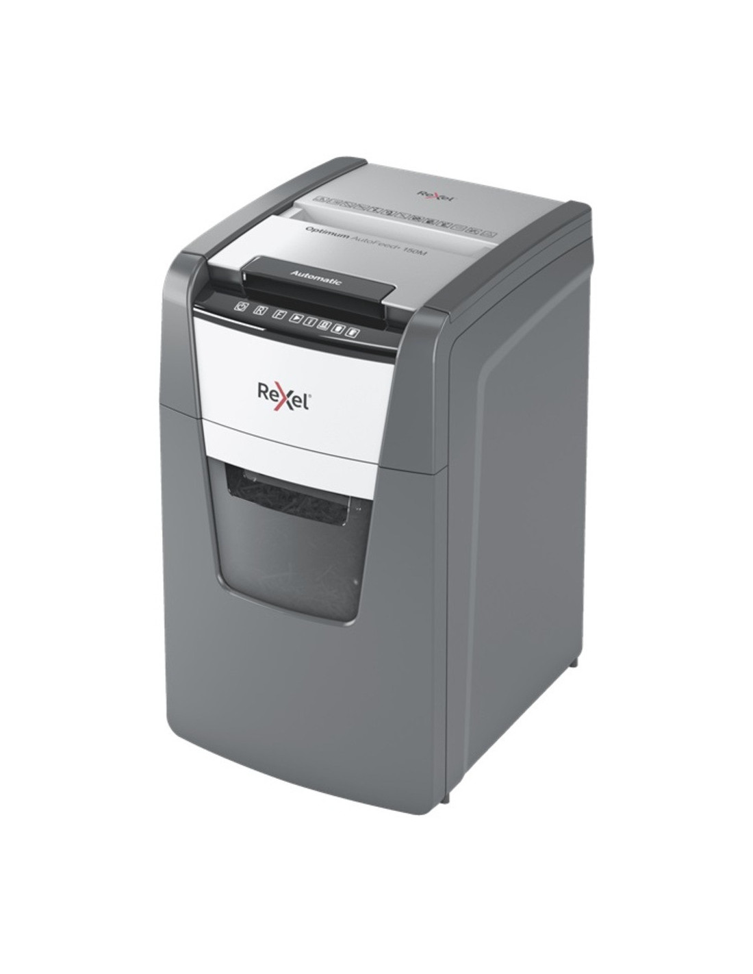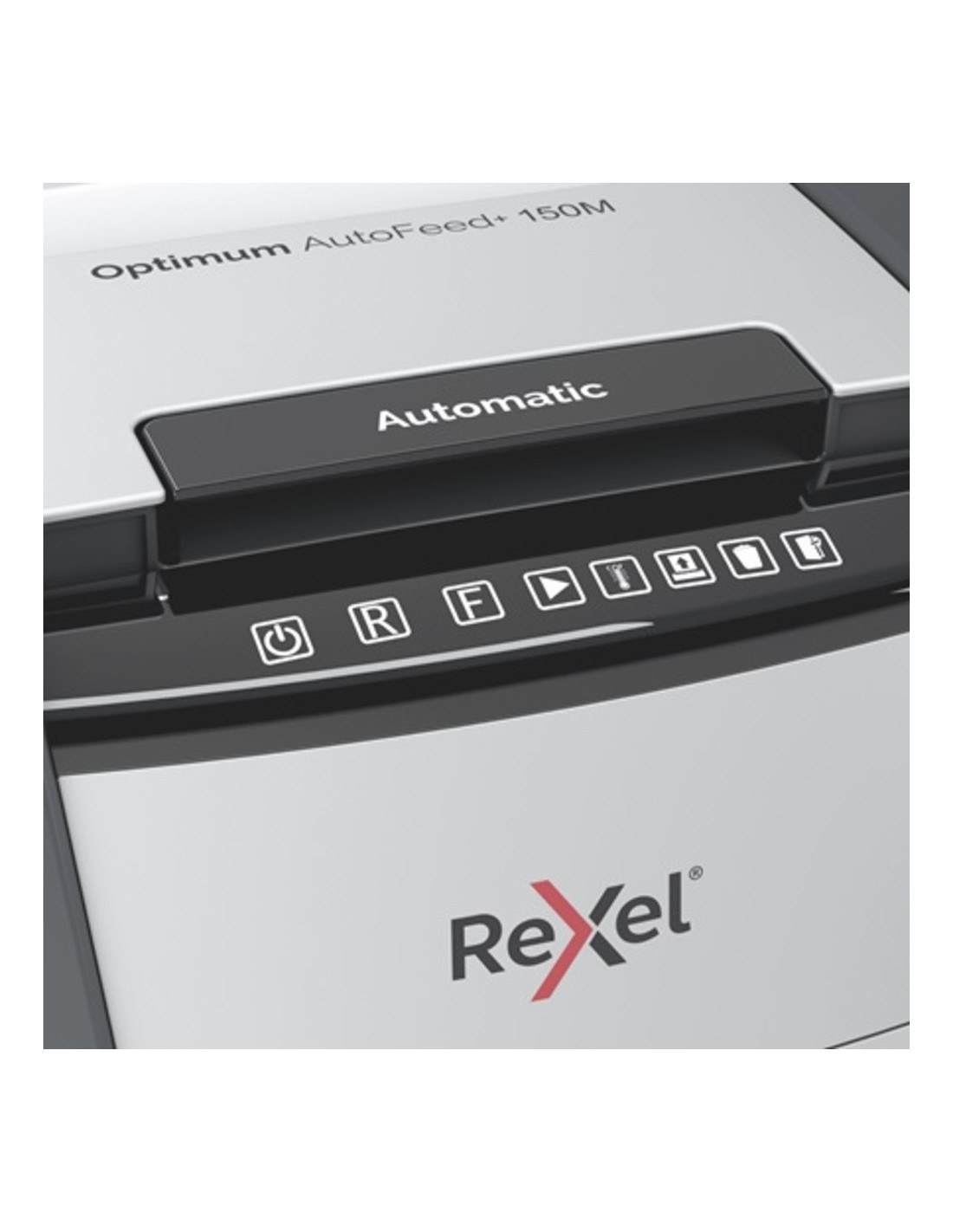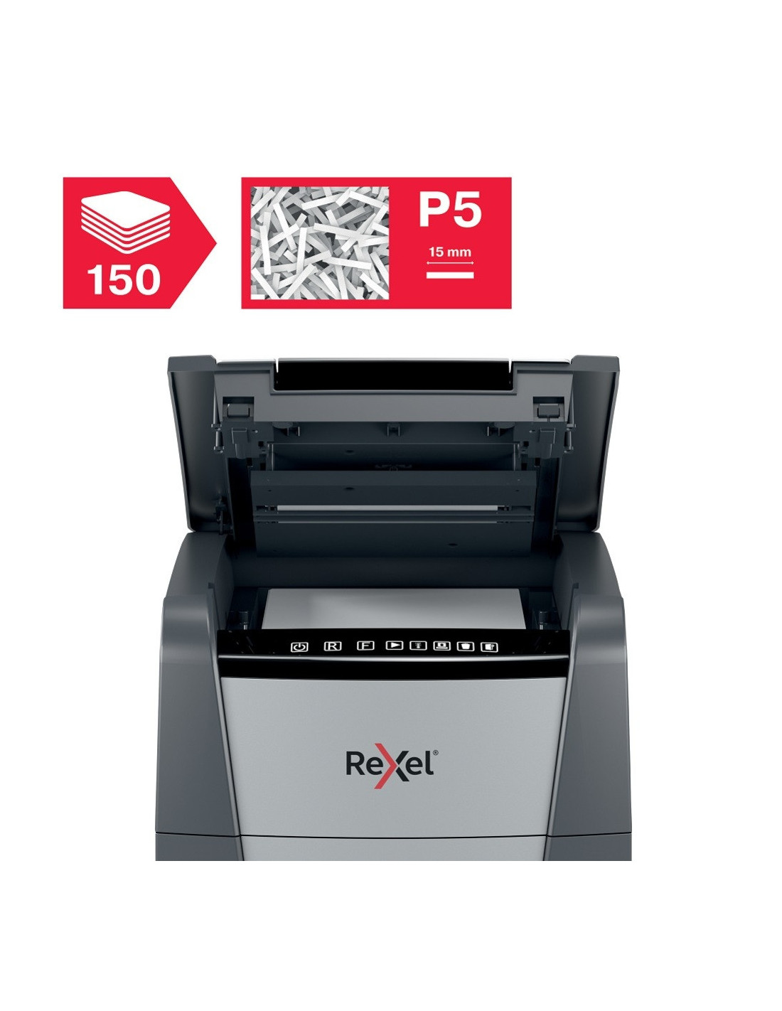 Distrugator documente automat REXEL Optimum 150M, P5, micro-cut, 150 coli, cos 44l, Negru-gri