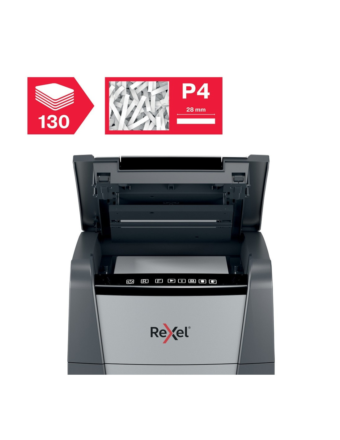 Distrugator documente automat REXEL Optimum 130M, P5, micro-cut, 130 coli, cos 44l, negru-gri