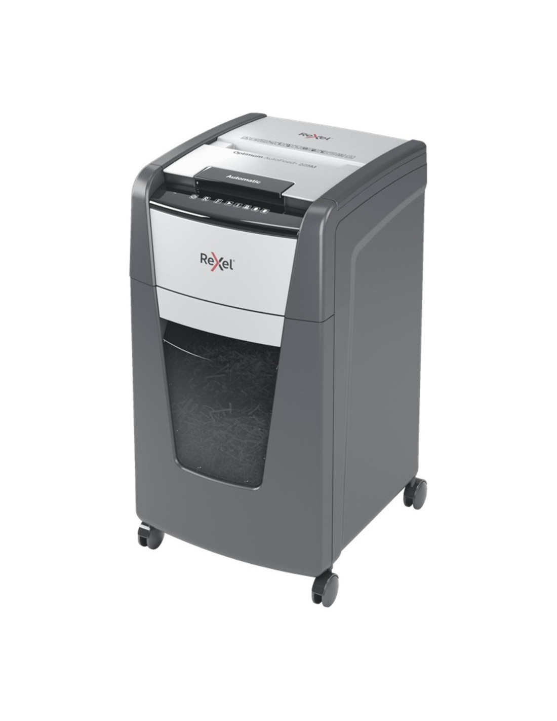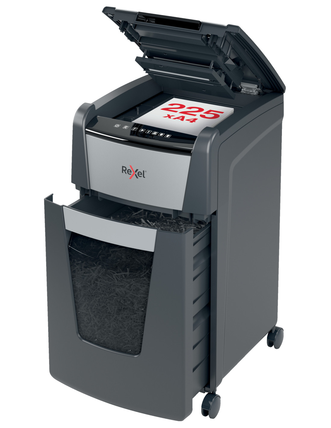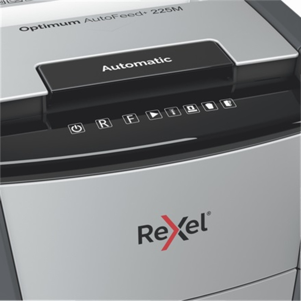 Distrugatorul automat pentru documente Rexel Optimum AutoFeed+ 225M distruge automat 225 coli A4 (80 gsm) dintr-o singura incarcare, in bucati de 2x15 mm (P-5, micro cut).