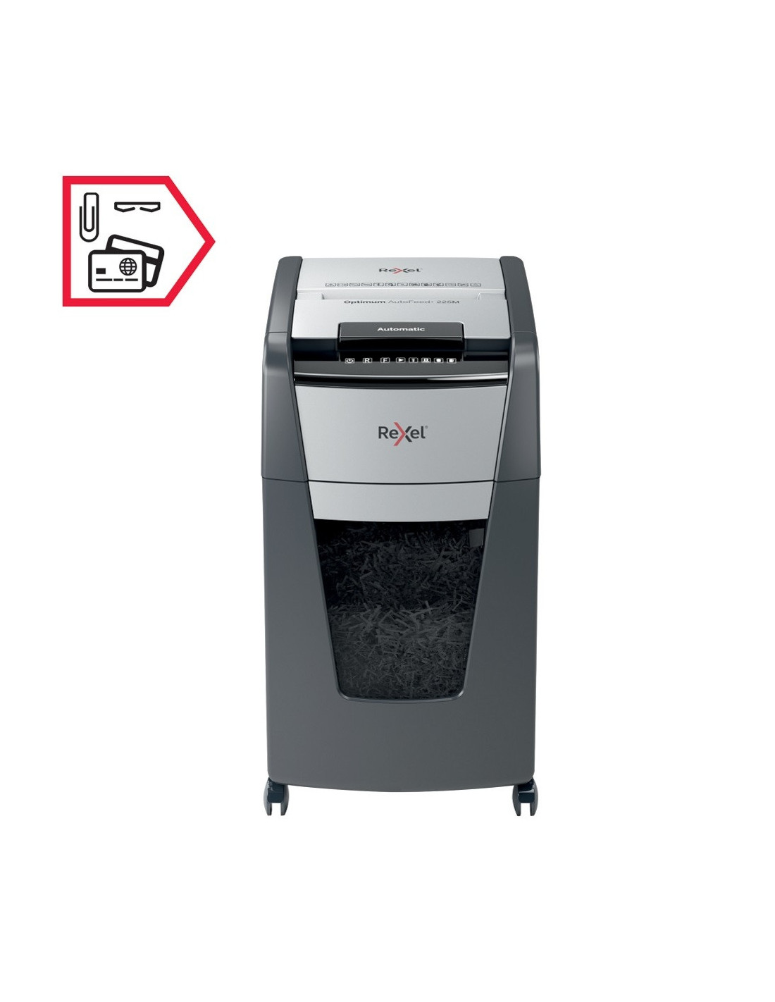 Distrugator documente automat REXEL Optimum 225M, P5, micro-cut, 225 coli, cos 60l, negru-gri