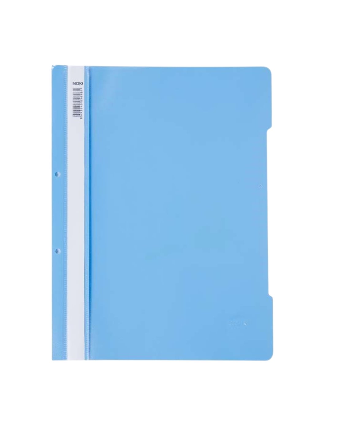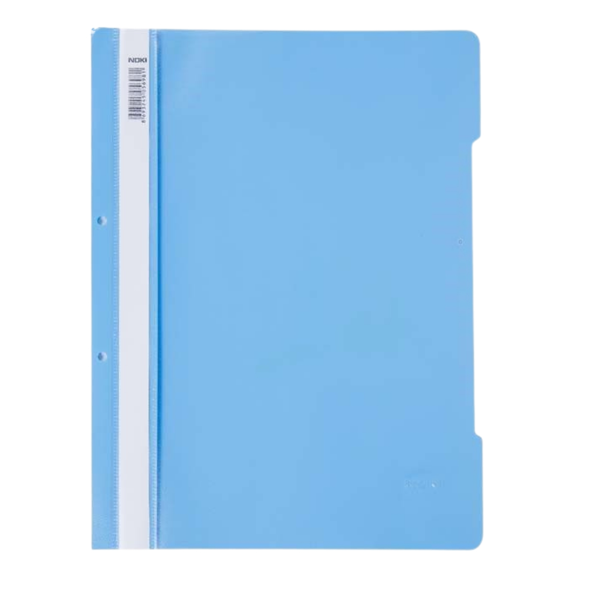 Dosarul din plastic NOKI cu șină și perforații, în nuanță albastru deschis, este o soluție practică și aerisită pentru organizarea documentelor în format A4. Fabricat din plastic rezistent, dosarul protejează foile și le menține ordonate, fiind potrivit pentru școală, birou sau uz personal.
