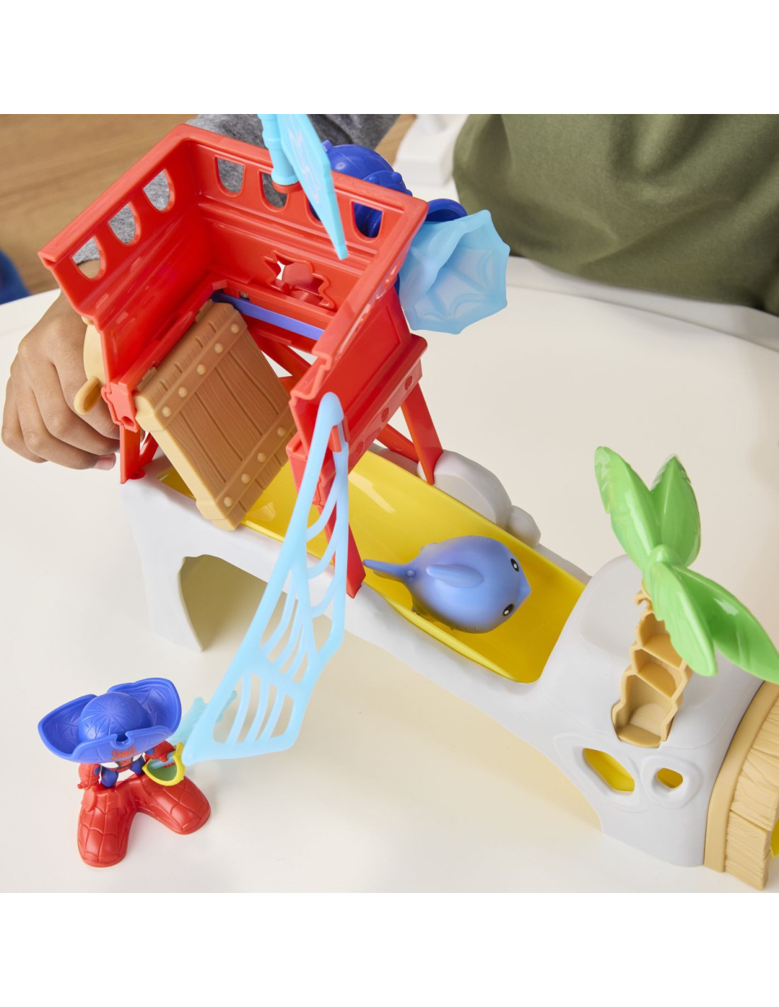 De asemenea, vine cu un palmier detasabil, un steag si un tun din panza de panza pe care figurina Spider-Man le poate tine cu mana sa tip C-grip!