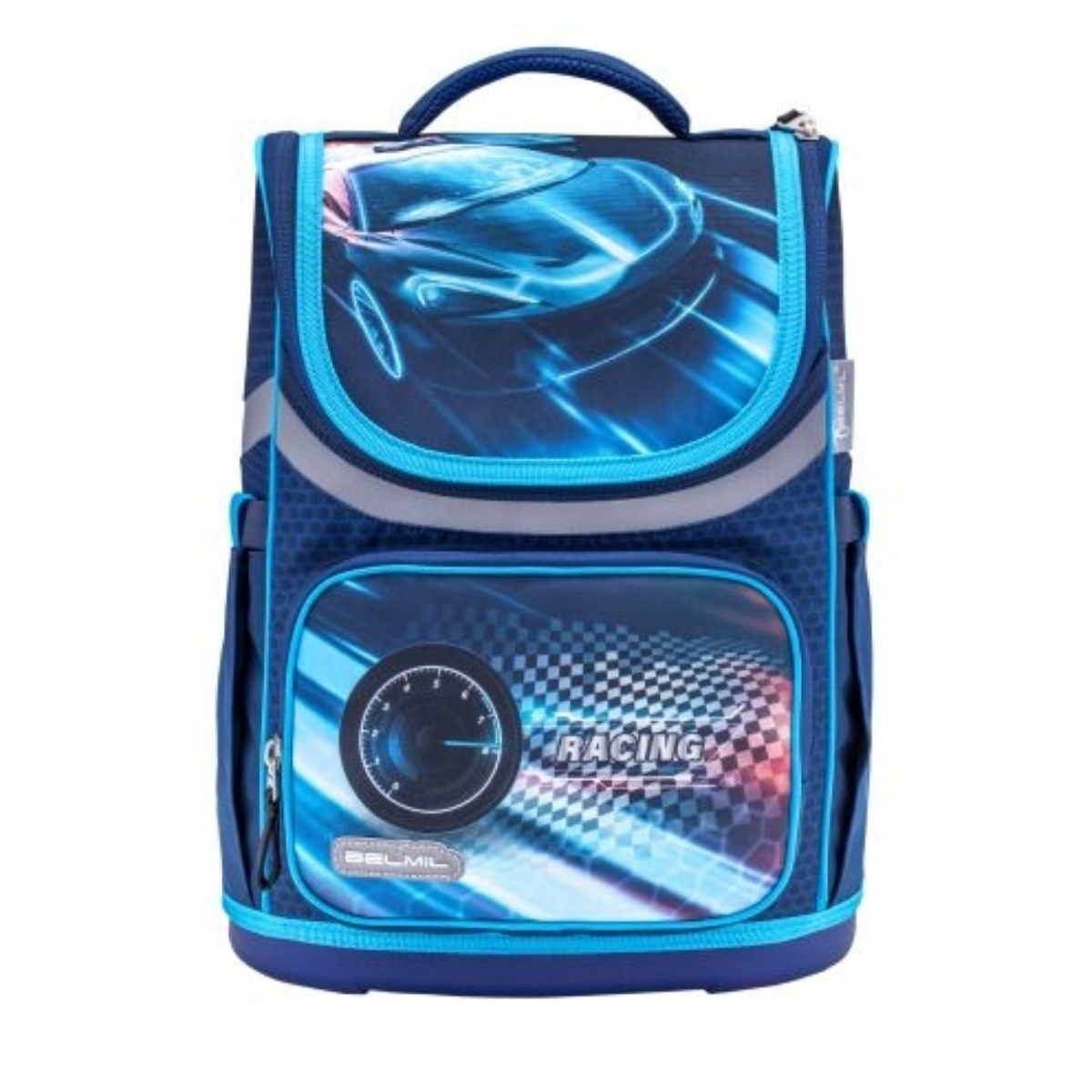 Ghiozdan neechipat mini Belmil, dimensiune 36x26x16 cm, motiv race blue