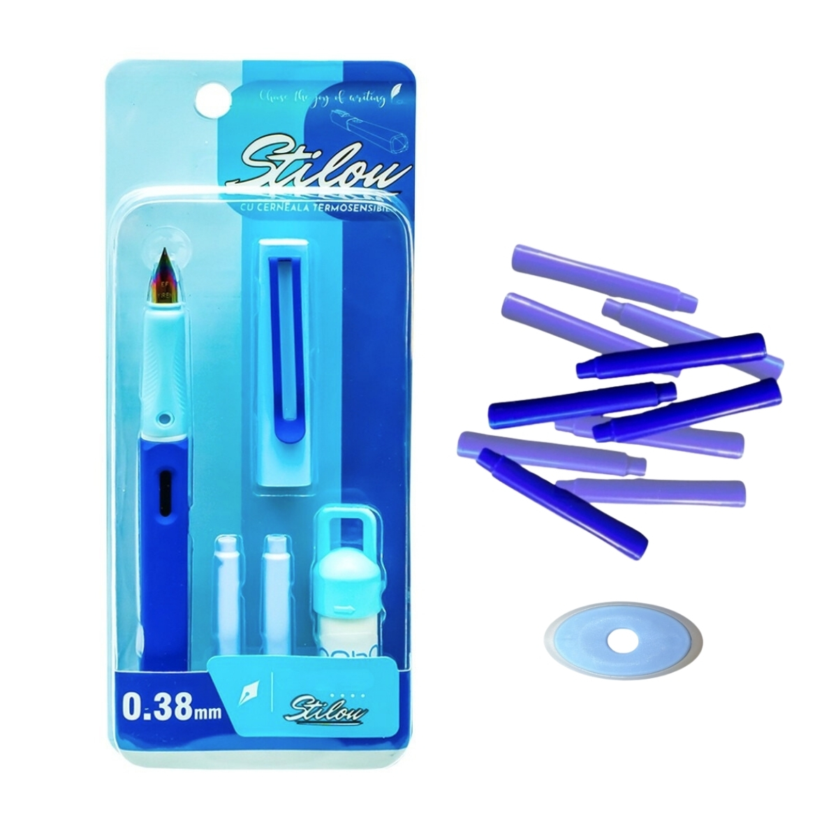 Set conținut: 1 stilou cu peniță clasică, 10 rezerve cerneală termosensibilă, 1 radieră