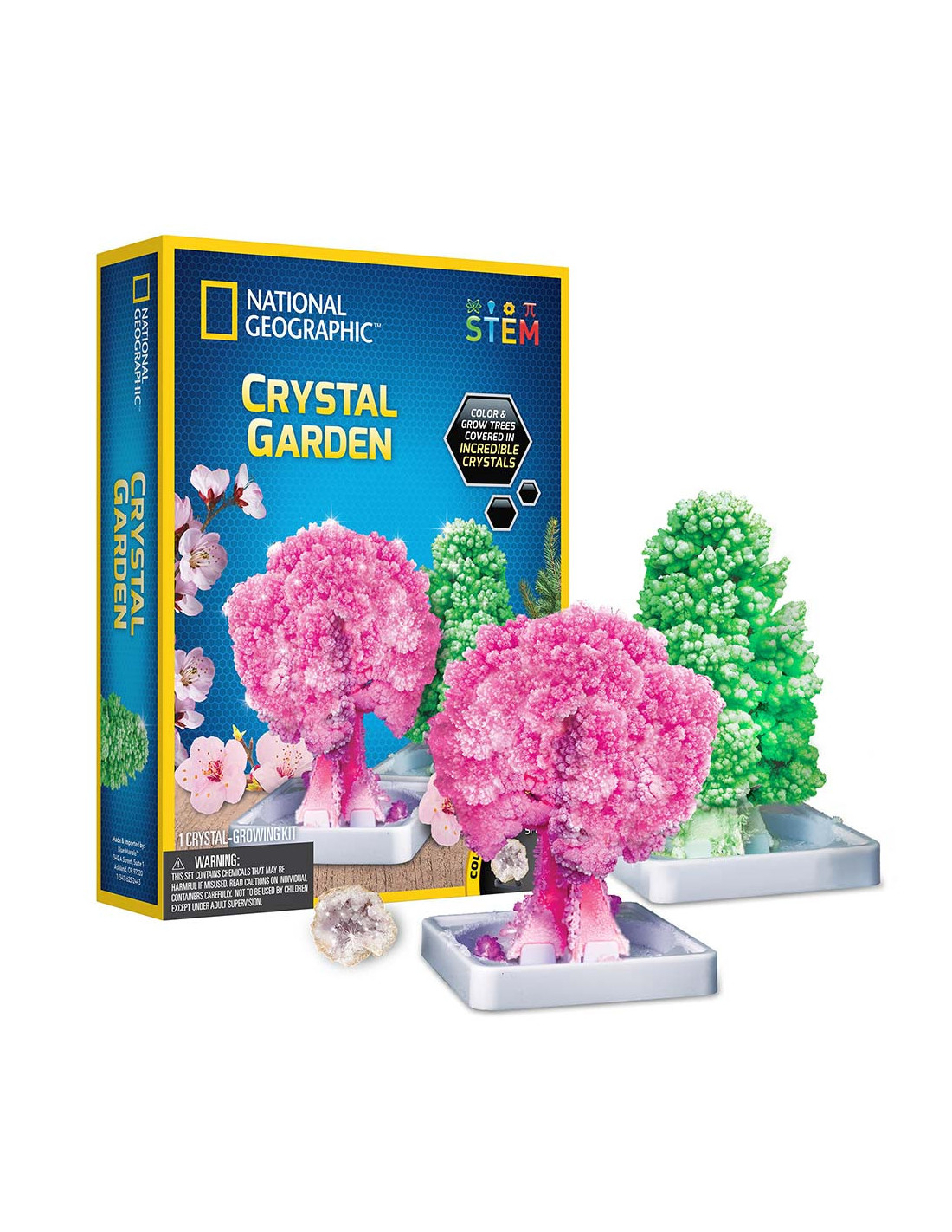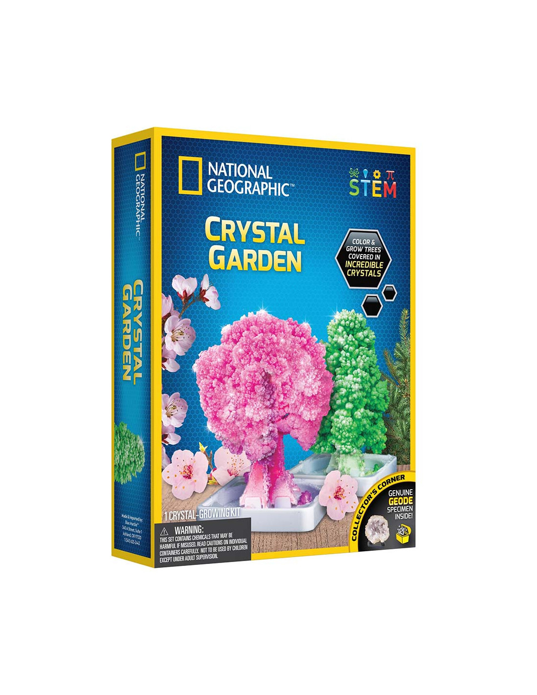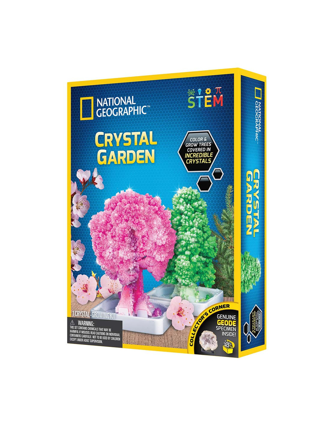 Acest kit stiintific include o solutie de crestere a cristalelor, doi copaci din carton, o platforma de baza, un specimen de geoda sparta, ghidul de invatare National Geographic si instructiuni..